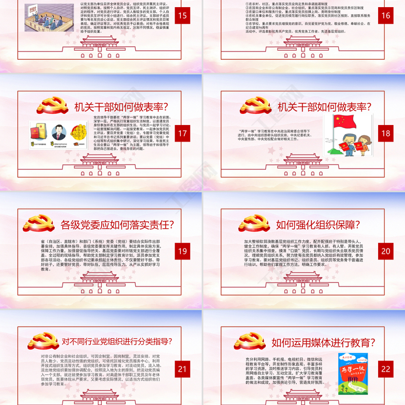 各級黨委應如何落實責任??。ㄗ灾螀^、直轄市)和部門(系統)黨委(黨組)要結合實際作出部署安排,加強具體指導??h級黨委要發揮關鍵作用,制定具體實施方案,保障工作力量,加強督促指導把關?;鶎狱h委要對所轄黨支部進行全覆蓋、全過程的現場指導,幫助黨支部制定學習教育計劃,派員參加黨支部各項活動。各級黨組織書記要承擔起主體責任,不僅要管好干部、帶好班子,還要管好黨員、帶好隊伍,層層傳導壓力,從嚴從實抓好學習教育。19