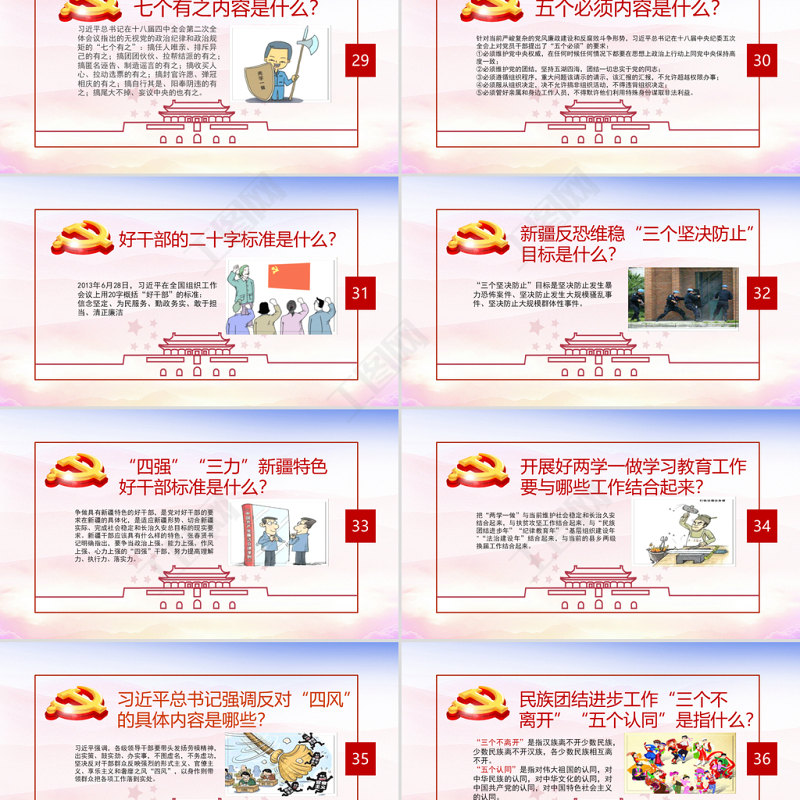 六個常見概念牢固樹立四個意識:政治意識、大局意識、核心意識、看齊意識。黨的群眾路線:黨在自己的工作中實行群眾路線,一切為了群眾,一切依靠群眾,從群眾中來,到群眾中去,把黨的正確主張變為群眾的自覺行為?!八膫€全面”的戰略布局:全面建成小康社會、全面深化改革、曲面依法治國、曲面從嚴治黨十八大以來提出的“四個自信” :堅持中國特色社會主義道路自信、理論自信、制度自信、文化自信。黨內重大問題處理原則:集中領導、民主集中、個別醞釀、會議決定。向黨的三大優良作風:理論聯系實際、密切聯系群眾、批評與自我批評。