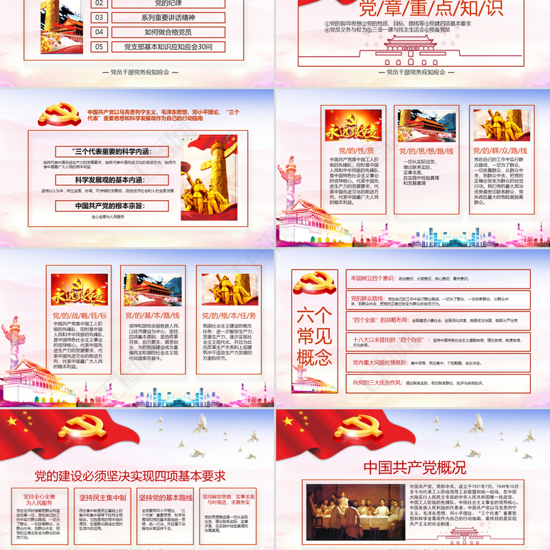 第一部分黨/章/重/點/知/識①黨的指導思想②黨的性質、目標、路線等③黨建四項基本要求④黨員義務與權力⑤三會一課與民主生活會⑥預備黨員 — 黨員干部黨務應知應會 —
