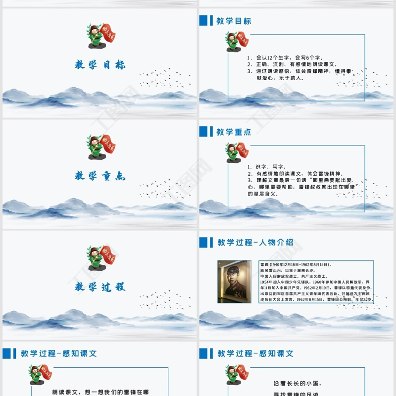 教學過程-人物介紹雷鋒(1940年12月18日-1962年8月15日), 原名雷正興,出生于湖南長沙。 中國人民解放軍戰士、共產主義戰士。 1954年加入中國少年先鋒隊,1960年參加中國人民解放軍,同年11月加入中國共產黨。1962年2月19日,雷鋒以特邀代表身份,出席沈陽軍區首屆共產主義青年團代表會議,并被選為主席團成員在大會上發言。1962年8月15日,雷鋒因公殉職,年僅22歲。