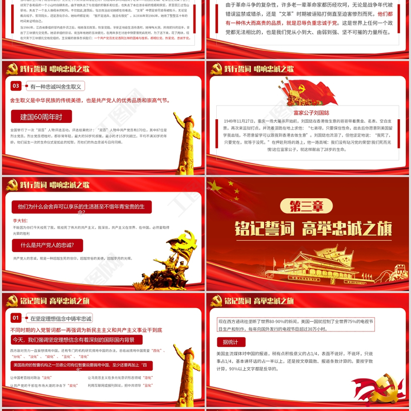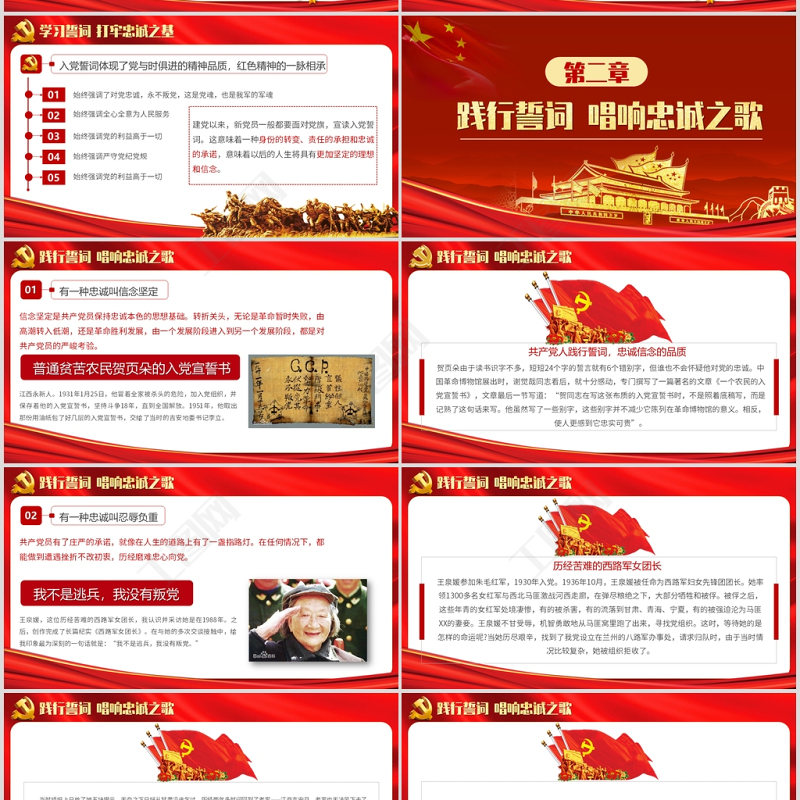 <p>永遠忠誠于黨</p><br><p>入黨誓詞我志愿加入中國共產黨,擁護黨的綱領,遵守黨的章程,履行黨員義務,執行黨的決定,嚴守黨的紀律,保守黨的秘密,對黨忠誠,積極工作,為共產主義奮斗終身,隨時準備為黨和人民犧牲一切,永不叛黨!</p><br><p>CONTENTS目錄</p><br><p>學習誓詞 打牢忠誠之基</p><br><p>學習誓詞 打牢忠誠之基犧牲個人,嚴守秘密,階級斗爭;努力革命,服從黨紀,永不叛黨。大革命失敗后,黨員數量從革命高潮時近六萬人銳減到一萬多人,黨組織被打散,活動被迫轉入地下,黨內一些意志不堅定分子在白色恐怖下背叛革命,給我們黨造成巨大損失。宣誓“永不叛黨”成為黨員經得住“殺頭”考驗而采用的形式,成為入黨之初的基本承諾,并作為一條鐵的紀律。</p><br><p>學習誓詞 打牢忠誠之基我志愿加入中國共產黨,堅持執行黨的紀律,不怕困難,不怕犧牲,為共產主義事業奮斗到底。抗日戰爭是一場艱苦的持久戰,黨員的一言一行都必須給非黨群眾一個好的影響,使他們對抗戰取得最終勝利充滿信心。最后一句永不叛黨強調忠誠,就是寧死不當漢奸。</p><br><p>學習誓詞 打牢忠誠之基我志愿加入中國共產黨,作如下宣誓:一、終身為共產主義事業奮斗。二、黨的利益高于一切。三、遵守黨的紀律。四、不怕困難,永遠為黨工作。五、要做群眾的模范。六、要保守黨的秘密。七、對黨有信心。八、百折不撓永不叛黨。又增了誠心誠意為工農勞苦群眾服務,為新民主主義和共產主義事業干到底,實事求是,執行命令的內容。</p><br><p>學習誓詞 打牢忠誠之基我志愿加入中國共產黨,承認黨綱黨章,執行黨的決議,遵守黨的紀律,保守黨的秘密,隨時準備犧牲個人一切,為全人類徹底解放奮斗終身。這個時期的入黨誓詞明確反映出黨的執政地位得到了確定,黨的綱領和章程已經規范,并成為黨員的行為標準,并強調了學習馬列主義、毛zd思想。黨執政了,“永不叛黨”這四個字在誓詞中沒有表述,但不屈不撓為共產主義事業奮斗到底,強調的還是忠誠。</p><br><p>學習誓詞 打牢忠誠之基我志愿加入中國共產黨,擁護黨的綱領,遵守黨的章程,履行黨員義務,執行黨的決定,嚴守黨的紀律,保守黨的秘密,對黨忠誠,積極工作,為共產主義奮斗終身,隨時準備為黨和人民犧牲一切,永不叛黨。入黨誓詞經過精煉概括后第一次寫進黨章,并重新把永不叛黨寫入誓詞內容,黨的十三大至十七大通過的黨章都沿用,重申了這一內容,把忠誠賦予新的意義,提到新的高度。</p><br><p>學習誓詞 打牢忠誠之基01始終強調了對黨忠誠,永不叛黨,這是黨魂,也是我軍的軍魂02始終強調全心全意為人民服務03始終強調黨的利益高于一切0405始終強調嚴守黨紀黨規始終強調黨的利益高于一切入黨誓詞體現了黨與時俱進的精神品質,紅色精神的一脈相承建黨以來,新黨員一般都要面對黨旗,宣讀入黨誓詞。這意味著一種身份的轉變、責任的承擔和忠誠的承諾,意味著以后的人生將具有更加堅定的理想和信念。</p><br><p>踐行誓詞 唱響忠誠之歌</p><br><p>踐行誓詞 唱響忠誠之歌有一種忠誠叫信念堅定信念堅定是共產黨員保持忠誠本色的思想基礎。轉折關頭,無論是革命暫時失敗,由高潮轉入低潮,還是革命勝利發展,由一個發展階段進入到另一個發展階段,都是對共產黨員的嚴峻考驗。江西永新人。1931年1月25日,他冒著全家被殺頭的危險,加入黨組織,并保存著他的入黨宣誓書,堅持斗爭18年,直到全國解放。1951年,他取出那份用油紙包了好幾層的入黨宣誓書,交給了當時的吉安地委書記李立。</p><br><p>踐行誓詞 唱響忠誠之歌賀頁朵由于讀書識字不多,短短24個字的誓言就有6個錯別字,但誰也不會懷疑他對黨的忠誠。中國革命博物館展出時,謝覺哉同志看后,就十分感動,專門撰寫了一篇著名的文章《一個農民的入黨宣誓書》,文章最后一節寫道:“賀同志在寫這張布質的入黨宣誓書時,不是照著底稿寫,而是記熟了這句話來寫。他雖然寫了一些別字,這些別字并不減少它陳列在革命博物館的意義。相反,使人更感到它忠實可貴”。共產黨人踐行誓詞,忠誠信念的品質</p><br><p>踐行誓詞 唱響忠誠之歌有一種忠誠叫忍辱負重共產黨員有了莊嚴的承諾,就像在人生的道路上有了一盞指路燈。在任何情況下,都能做到遭遇挫折不改初衷,歷經磨難忠心向黨。王泉媛,這位歷經苦難的西路軍女團長,我認識并采訪她是在1988年。之后,創作完成了長篇紀實《西路軍女團長》。在與她的多次交談接觸中,給我印象最為深刻的一句話就是:“我不是逃兵,我沒有叛黨。”</p><br><p>踐行誓詞 唱響忠誠之歌王泉媛參加朱毛紅軍,1930年入黨。1936年10月,王泉媛被任命為西路軍婦女先鋒團團長。她率領1300多名女紅軍與西北馬匪激戰河西走廊,在彈盡糧絕之下,大部分犧牲和被俘。被俘之后,這些年青的女紅軍處境凄慘,有的被殺害,有的流落到甘肅、青海、寧夏,有的被強迫淪為馬匪XX的妻妾。王泉媛不甘受辱,機智勇敢地從馬匪窩里跑了出來,尋找黨組織。這時,等待她的是怎樣的命運呢?當她歷盡艱辛,找到了我黨設立在蘭州的八路軍辦事處,請求歸隊時,由于當時情況比較復雜,她被組織拒收了。歷經苦難的西路軍女團長</p><br><p>踐行誓詞 唱響忠誠之歌當時組織上只給了她五塊銀元,無奈之下只好從甘肅沿途乞討,歷經兩年多時間回到了老家——江西吉安縣。老家也無法呆下去了,