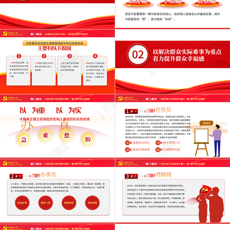 工圖網(wǎng)提供群眾滿意度黨課PPT紅色黨政風(fēng)2022年度積極踐行群眾路線全面提升群眾滿意度專題黨性教育課件模板供會員免費下載。更多精彩黨課PPT素材,盡在工圖網(wǎng)。