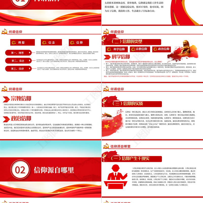 何謂信仰宗教信仰是指信奉某種宗教的人對自己所信仰的教理教義,由認同和崇拜而產生的堅定不移的信念以及全身心的皈依。在宗教問題上,我們要注意三個非常重要的原則:第一,公民有信仰宗教的自由;第二,共產黨員不能信仰宗教;第三,不能在宗教活動場所以外進行宗教活動。宗教信仰是一個非常重要的問題,盡管社會上有宗教信仰的人相對較少,但宗教信仰帶來的影響力不小,如果我們處理不好,就有可能引發文化沖突、民族矛盾,甚至會危害國家統一。所以,對于這個問題,我們要引起足夠的重視。政治信仰是人們對既定的政治形態的認同,是對政治的終極關懷。它包括我們對政黨及其理論、政策的一種認識和理解。當前及今后,我們應該堅持馬克思主義的理論信仰,堅持共產主義的社會發展信仰,堅持中國共產黨集中統一領導的政黨信仰。這是政治信仰的基本要求。由此可見,政治信仰是我們今天交流的主題,是信仰力量的一個核心。