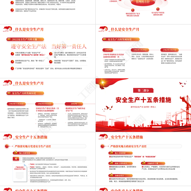 工圖網(wǎng)提供遵守安全生產(chǎn)法當好第一責任人PPT紅色大氣風2022安全生產(chǎn)月宣傳安全教育課件模板供會員免費下載。更多精彩黨課PPT素材,盡在工圖網(wǎng)。