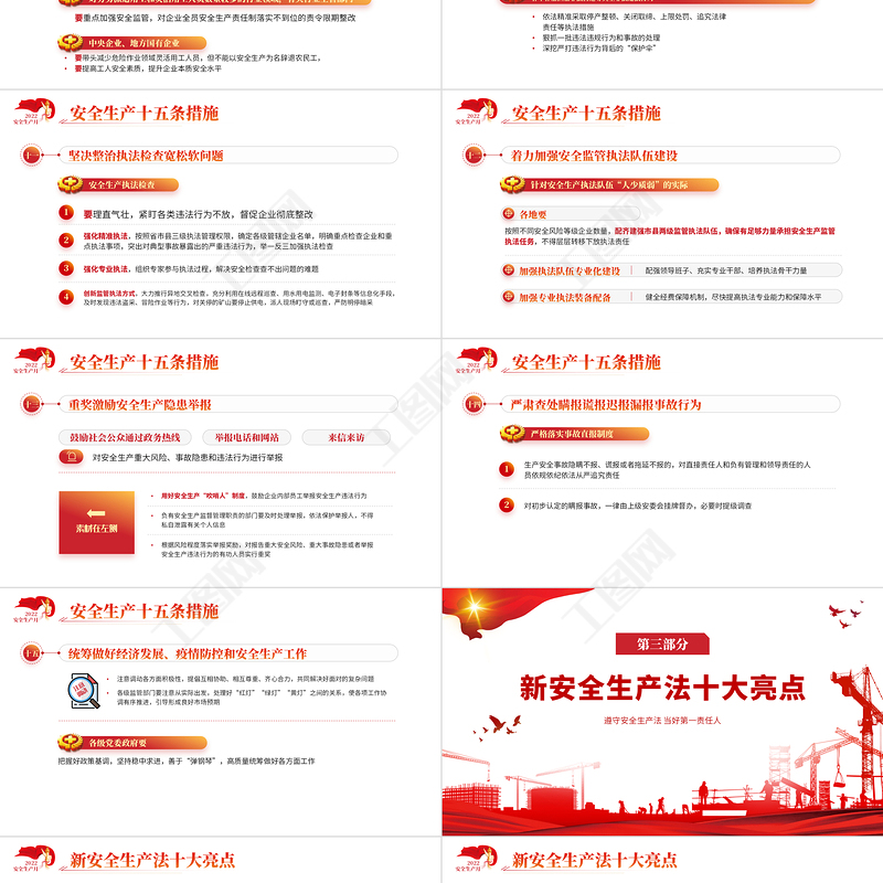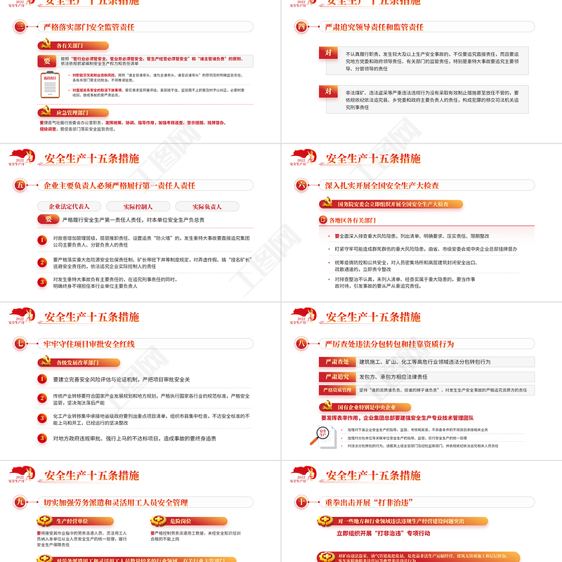 安全生產(chǎn)十五條措施2022安全生產(chǎn)月堅決整治執(zhí)法檢查寬松軟問題十一安全生產(chǎn)執(zhí)法檢查要理直氣壯,緊盯各類違法行為不放,督促企業(yè)徹底整改1強化精準執(zhí)法,按照省市縣三級執(zhí)法管理權(quán)限,確定各級管轄企業(yè)名單,明確重點檢查企業(yè)和重點執(zhí)法事項,突出對典型事故暴露出的嚴重違法行為,舉一反三加強執(zhí)法檢查2強化專業(yè)執(zhí)法,組織專家參與執(zhí)法過程,解決安全檢查查不出問題的難題3創(chuàng)新監(jiān)管執(zhí)法方式,大力推行異地交叉檢查,充分利用在線遠程巡查、用水用電監(jiān)測、電子封條等信息化手段,及時發(fā)現(xiàn)違法盜采、冒險作業(yè)等行為,對關(guān)停的礦山要停止供電,派人現(xiàn)場盯守或巡查,嚴防明停暗采4