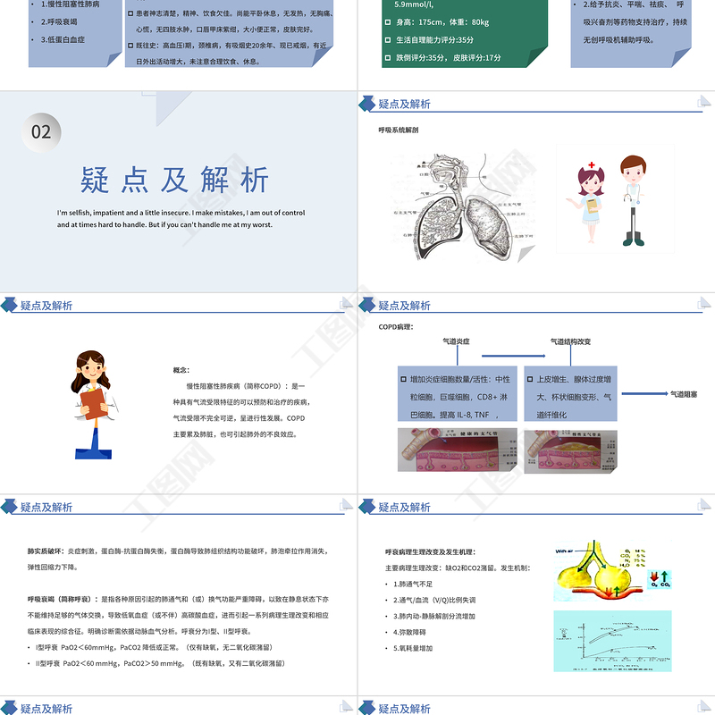 病例介紹9床 XX 男 XX歲 住院號:XXXXXXX 診斷:1.慢性阻塞性肺病 2.呼吸衰竭 3.低蛋白血癥患者主訴:間斷咳嗽、咳痰、喘氣4年余,近一年來無明顯誘因癥狀加重,咳白色粘稠痰液,并有喘息、氣促,活動后加重。20XX-XX-XX因受涼后咳嗽、喘息加重一天,以“慢性阻塞性肺病”收我科?;颊呱裰厩宄?,精神、飲食欠佳。尚能平臥休息,無發熱,無胸痛、心慌,無四肢水腫,口唇甲床紫紺,大小便正常,皮膚完好。既往史:高血壓I期,頸椎病,有吸煙史20余年、現已戒煙,有近日外出活動增大,未注意合理飲食、休息。