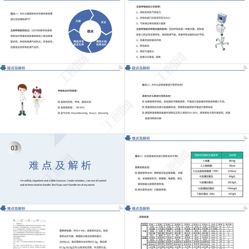疑點及解析疑點二:為什么該患者要進行營養支持?患者為什么要進行營養支持:長期使用呼吸機,急性期給予靜脈營養,不能經口進食最終導致食物攝入不足?;颊呤褂每股匾鹁菏д{,使胃腸功能受損不能進行營養吸收慢阻肺患者靜息能量的消耗比正常人增加15%-20%,使患者處于高代謝狀態,加速能量消耗和分解