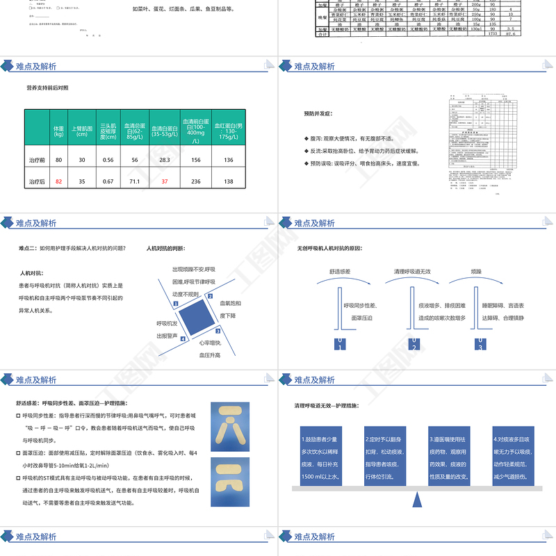 難點及解析清理呼吸道無效—護理措施:1.鼓勵患者少量多次飲水以稀釋痰液,每日補充1500 ml以上水。2.定時予以翻身扣背,松動痰液,指導患者咳痰,行體位引流。3.遵醫囑使用祛痰藥物,觀察用藥效果,痰液的性質及量的改變。4.對痰液多且咳嗽無力予以吸痰,動作輕柔規范,減少氣道損傷。
