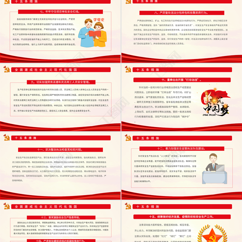 十五條措施 國務院安委會立即組織開展全國安全生產大檢查。各地區各有關部門要全面深入排查重大風險隱患,列出清單、明確要求、壓實責任、限期整改。盯緊守牢可能造成群死群傷的重大風險隱患,由省、市級安委會或中央企業總部掛牌督辦。統籌疫情防控和公共安全,對人員密集場所和高層建筑封閉安全出口、疏散通道的,立即責令整改。對排查整治不認真,未列入清單、經查實屬于重大隱患的,要當作事故對待,引發事故的要從嚴從重追究責任。六、深入扎實開展全國安全生產大檢查。
