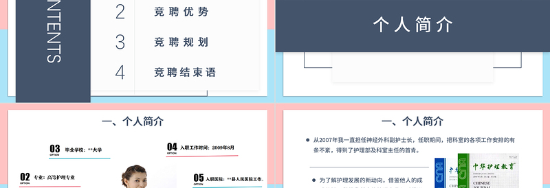 二、競聘優勢在大學期間,我系統地學習了護理專業知識,在臨床工作中能夠理論聯系實踐,不斷總結工作中的經驗教訓,為從事兒科的護理工作打下了扎實的基礎。我苦練基本功,對操作技術精益求精。多年來我練就了過硬的靜脈穿刺技術,并熟練掌握了兒科的急診急救技術。參與科室的重大搶救工作,能夠做到隨叫隨到,任勞任怨。科室管理方面,我是護士長的得力助手,能主動幫助護士長協調科室的繁瑣事物,為科室的護理工作出謀劃策,深得護士長及科室護士們的信賴,并受到醫患的一致好評。豐富的護理工作經驗0203具有較強的團隊協作意識