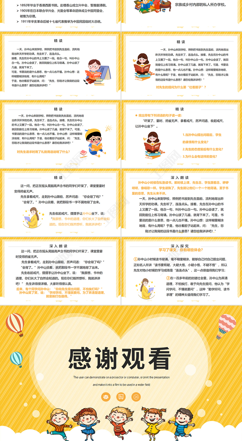深入朗讀 孫中山小時侯在私塾讀書。那時侯上課,先生念,學生跟著念,咿咿呀呀,像唱歌一樣。學生讀熟了,先生就讓他們一個一個地背誦。至于書里的意思,先生從來不講。 一天,孫中山來到學校,照例把書放到先生面前,流利地背出昨天所學的功課。先生聽了,連連點頭。接著,先生在孫中山的書上又圈了一段。他念一句,叫孫中山念一句。孫中山會讀了,就回到座位上練習背誦。孫中山讀了幾遍,就背下來了。可是,書里說的是什么意思,他一點兒也不懂。孫中山想:這樣糊里糊涂地背,有什么用呢?于是,他壯著膽子站起來,問:“先生,您剛才讓我背的這段書是什么意思?請您給我講講吧!”