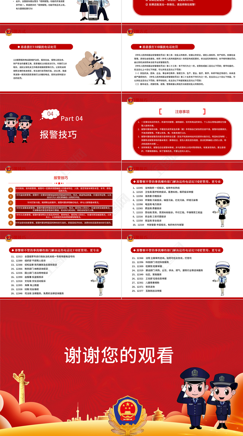 <p>110你真的會用嗎110宣傳日實用宣傳篇</p><br><p>每年1月10日,是全國110宣傳日。2020年1月10日,是第34個全國110宣傳日。前 言</p><br><p>目錄110服務(wù)內(nèi)容及職責報警方式報警技巧01歷史由來</p><br><p>Part 01歷史由來</p><br><p>110是公安機關(guān)向社會公布的受理人民群眾報警求助的全國統(tǒng)一的特種服務(wù)電話號碼。1986年1月,我國第一家110報警服務(wù)臺在廣州誕生。110報警服務(wù)臺保持24小時全天候值班,隨時接受人民群眾緊急報警和緊急救助,為人民群眾提供服務(wù),有力地維護了社會穩(wěn)定,保障了人民群眾的正常學習、生活和工作秩序。歷史的由來</p><br><p>歷史的由來1986年,中國第一個110報警臺在廣州建立。1996年10月,明確規(guī)定當事人撥打110電話一律免收話費。1998年,公安部統(tǒng)一規(guī)定了110接警、受理、處警等各環(huán)節(jié)的工作標準。2003年5月,公安部出臺《110接處警工作規(guī)則》。2004年3月,公安部要求各級公安機關(guān),尤其是縣市一級公安機關(guān),合理整合內(nèi)部資源,大力推進110、119、122"三臺合一"的工作。2008年,公安部要求各地公安機關(guān)將短信報警號碼統(tǒng)一為12110</p><br><p>Part 02110服務(wù)內(nèi)容及職責</p><br><p>110服務(wù)內(nèi)容及職責根據(jù)公安部《縣市級公安機關(guān)指揮中心工作規(guī)范》的規(guī)定,110報警服務(wù)臺的職責范圍主要包括報警、求助、投訴三個方面,其具體服務(wù)內(nèi)容為:</p><br><p>110服務(wù)內(nèi)容及職責(一)110報警服務(wù)臺受理報警的范圍:刑事案件;治安案(事)件;危及人身、財產(chǎn)安全或者社會治安秩序的群體性事件;火警、交通事故警情及其他治安災(zāi)害事故、自然災(zāi)害事故;其他需要公安機關(guān)處置的與違法犯罪和公共安全有關(guān)的報警。</p><br><p>110服務(wù)內(nèi)容及職責(二)110報警服務(wù)臺受理求助的范圍:發(fā)生溺水、墜樓、自殺等狀況,需要公安機關(guān)緊急救助的;老人、兒童以及智障人員、精神疾病患者等人員走失,需要公安機關(guān)在一定范圍內(nèi)幫助查找的;公眾遇到危難,處于孤立無援狀況,需要立即救助的;涉及水、電、氣、熱等公共設(shè)施出現(xiàn)險情,威脅公共安全、人身或者財產(chǎn)安全和工作、學習、生活秩序,需要公安機關(guān)先期緊急處置的;需要公安機關(guān)處理的其他緊急求助事項。</p><br><p>110服務(wù)內(nèi)容及職責(三)受理投訴范圍:公安機關(guān)及其人民警察正在發(fā)生的違反《中華人民共和國人民警察法》、《公安機關(guān)督察條例》等法律、法規(guī)和人民警察各項紀律規(guī)定,違法行使職權(quán),不履行法定職責,不遵守各項執(zhí)法、服務(wù)、組織、管理制度和職業(yè)道德的各種行為。</p><br><p>110服務(wù)內(nèi)容及職責受理110、119、122電話報警、緊急求助和對正在發(fā)生的人民警違法違紀或者失職行為;受理基層公安機關(guān)和執(zhí)勤巡邏民警報告的緊急情況及各類案件、事故。與政府各職能部門保持聯(lián)系,及時傳達群眾相關(guān)求助要求。</p><br><p>Part 03報警方式</p><br><p>報警方式① 就近及時報警任何有電話的單位、個人及公用電話都應(yīng)為報警人提供方便。萬一自己無法報警,要及時委托他人幫忙報警。② 準確陳述情況現(xiàn)場的原始狀態(tài)如何;有無采取措施;犯罪分子或可疑人員的人數(shù)、特點、攜帶物品和逃跑方向等。另外,還要提供報警人所在位置、姓名和聯(lián)系方式。③ 協(xié)助配合處理無特殊情況,報警后應(yīng)在報警地守候,主動與趕到的民警取得聯(lián)系,詳細介紹情況并積極協(xié)助。④ 切忌表達不清說地點要先說哪個區(qū),再說某街道等具體地點。要說清楚案件的性質(zhì),如歹徒使用何種兇器,以便警方派出不同警種。</p><br><p>報警方式12122提供啥服務(wù)?①接受駕駛員在高速公路上的事故報警;②駕駛員開車在高速公路上車輛發(fā)生拋錨、炸胎等突發(fā)情況,且無法挪移需要外部力量協(xié)助施救的報警;③接受路況咨詢。</p><br><p>報警方式①大致方向:講清行駛道路和方向;②精確地點:精確到百米牌;(百米牌,一般位于道路右側(cè)護欄上,每隔一百米設(shè)置一塊。)③具體位置:停留在哪一車道;④發(fā)生事由:炸胎、事故、拋錨等情況,如是貨車需說清所載貨物與大約重量。</p><br><p>報警方式公安部已與相關(guān)部門確定將“12110”作為全國公安機關(guān)統(tǒng)一的公益性短信報警號碼。(1)發(fā)送短信至12110+區(qū)號后三位,縮短短信報警時間(2)報警短信要說清:在哪里發(fā)生了什么事?案(事)件發(fā)生的時間、地點、簡要案(事)件內(nèi)容、其他特殊需要說明的情況、訴求等。如無法確定方位的,可指出路邊有明顯特征的參照物,如隧道、出入口名稱、路牌、標志性建筑物等。(3)關(guān)注短信回復如果使用短信報警,接警員在接到短信報警后會即時向發(fā)信人回復確認收到短信,所以短信報警后報警人也要及時關(guān)注手機短信,確認是否收到回復。</p><br><p>報警方式全國各地警方普遍開發(fā)了短信報警、微信報警等報警平臺。一般在當?shù)鼐降墓娞枴PP中嵌入了報警系統(tǒng),請在網(wǎng)上搜索一下所在省份或城市的相關(guān)信息。此外,全國類似煙臺警方「視頻報警」功能的開發(fā