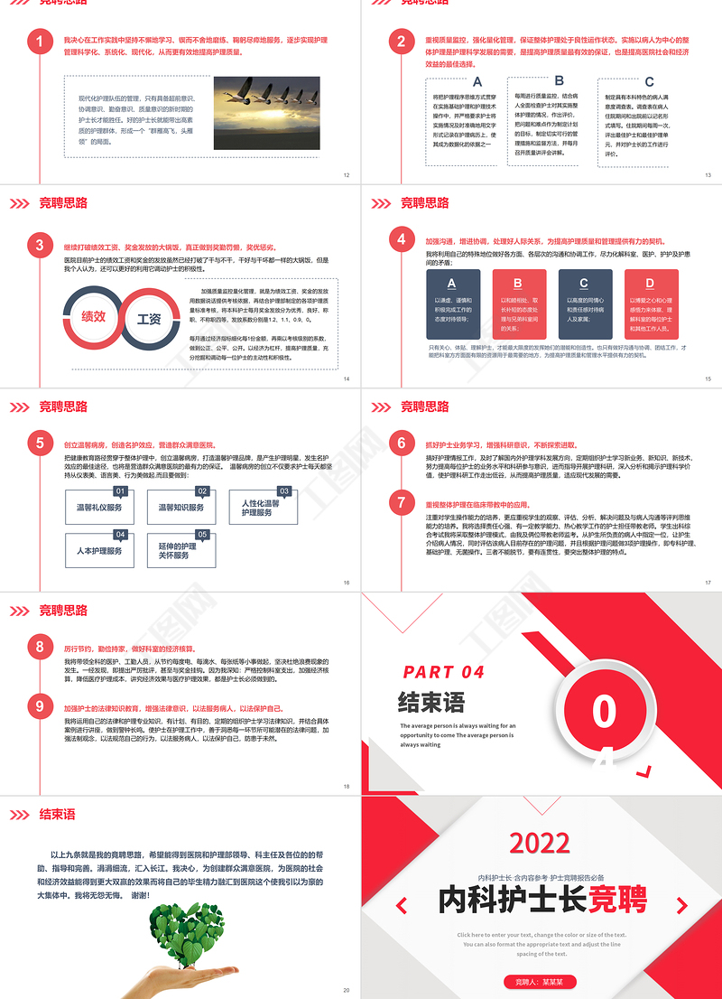 以上九條就是我的竟聘思路,希望能得到醫院和護理部領導、科主任及各位的的幫助、指導和完善。涓涓細流,匯入長江。我決心,為創建群眾滿意醫院,為醫院的社會和經濟效益能得到更大雙贏的效果而將自己的畢生精力融匯到醫院這個使我引以為豪的大集體中。我將無怨無悔。 謝謝!結束語