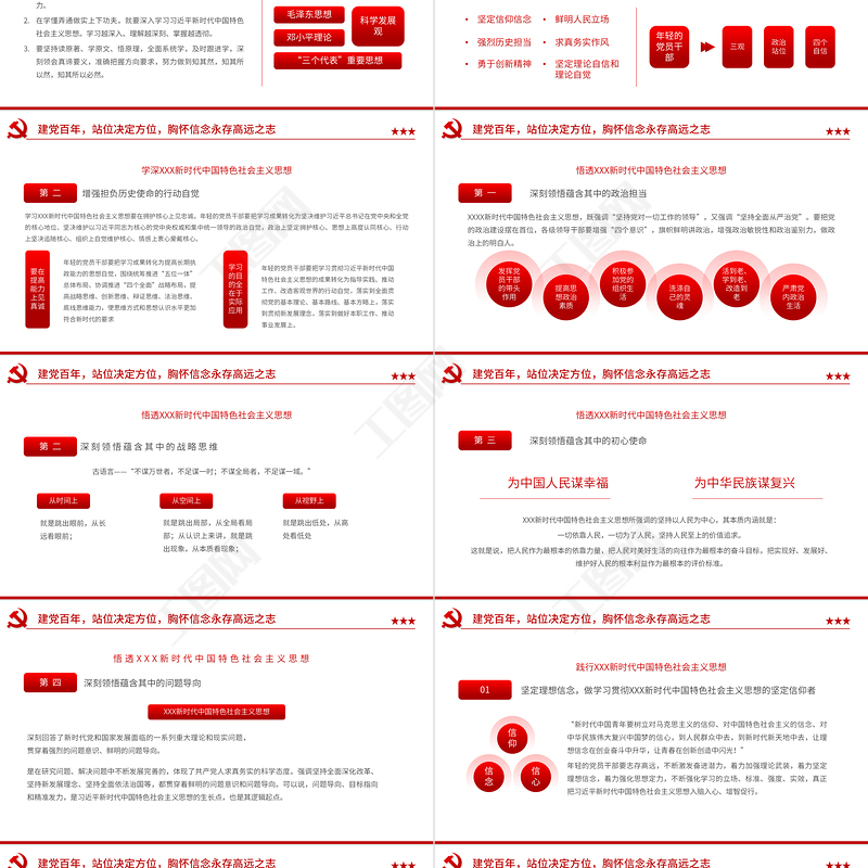學(xué)深XXX新時代中國特色社會主義思想學(xué)習(xí)XXX新時代中國特色社會主義思想要在擁護核心上見忠誠。年輕的黨員干部要把學(xué)習(xí)成果轉(zhuǎn)化為堅決維護總書記在黨中央和全黨的核心地位、堅決維護以同志為核心的黨中央權(quán)威和集中統(tǒng)一領(lǐng)導(dǎo)的政治自覺,政治上堅定擁護核心、思想上高度認同核心、行動上堅決追隨核心、組織上自覺維護核心、情感上衷心愛戴核心。要在提高能力上見真誠年輕的黨員干部要把學(xué)習(xí)成果轉(zhuǎn)化為提高長期執(zhí)政能力的思想自覺,圍繞統(tǒng)籌推進“五位一體”總體布局、協(xié)調(diào)推進“四個全面”戰(zhàn)略布局,提高戰(zhàn)略思維、創(chuàng)新思維、辯證思維、法治思維、底線思維能力,使思維方式和思想認識水平更加符合新時代的要求學(xué)習(xí)的目的全在于實際應(yīng)用年輕的黨員干部要把學(xué)習(xí)貫徹新時代中國特色社會主義思想的成果轉(zhuǎn)化為指導(dǎo)實踐、推動工作、改造客觀世界的行動自覺,落實到全面貫徹黨的基本理論、基本路線、基本方略上,落實到貫徹新發(fā)展理念,落實到做好本職工作、推動事業(yè)發(fā)展上。建黨百年,站位決定方位,胸懷信念永存高遠之志