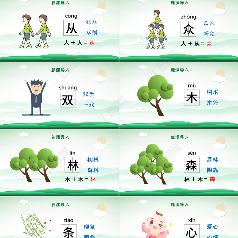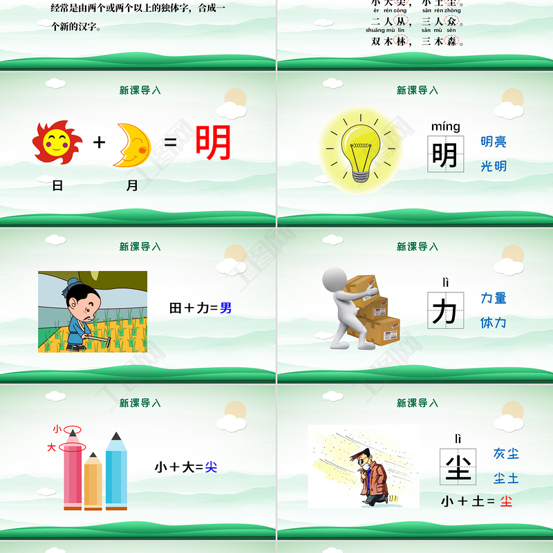 新課導入日月明,田力男。小大尖,小土塵。二人從,三人眾。雙木林,三木森。 rì yuè mínɡ tián lì nán日月明rì yuè mínɡ xiǎo dà jiān xiǎo tǔ chénèr rén cónɡ sān rén zhònɡshuānɡ mù lín sān mù sēn
