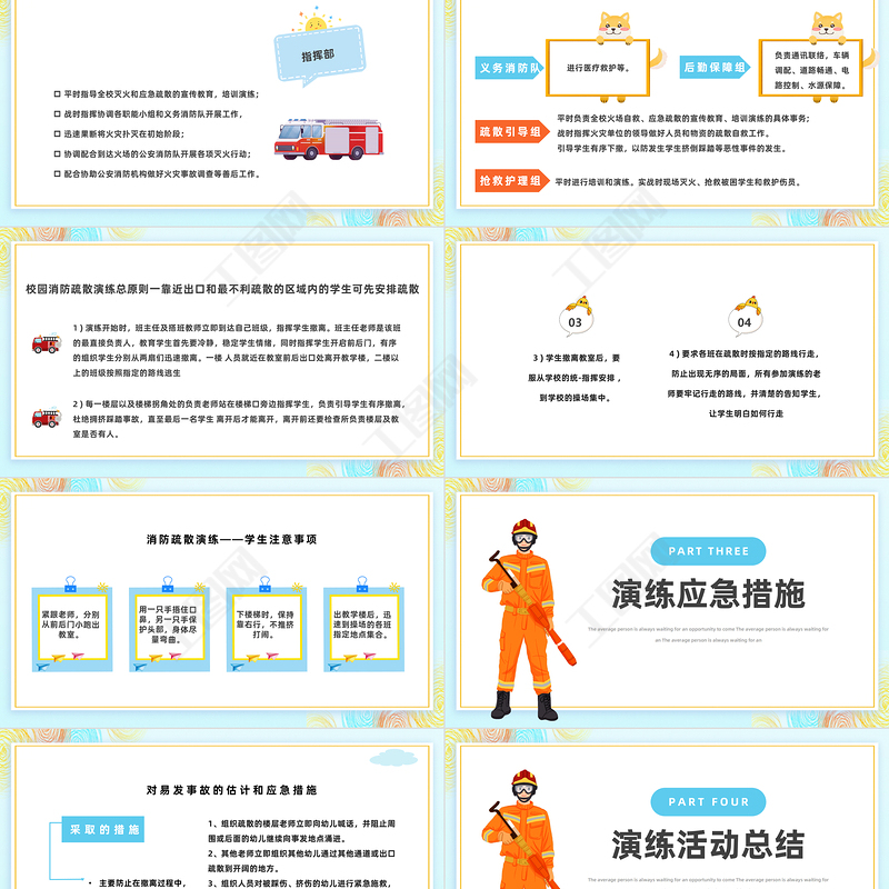 2022幼兒園消防演練PPT藍色卡通風幼兒園中小學生消防安全演練主題班會培訓課件模板