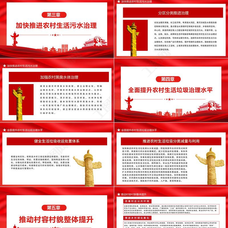 <p>中共中央辦公廳 國務(wù)院辦公廳印發(fā)《農(nóng)村人居環(huán)境整治提升五年行動方案(2021-2025年)》宣講人:某某某 時間:20XX.XX</p><br><p>改善農(nóng)村人居環(huán)境,是以習(xí)近平同志為核心的黨中央從戰(zhàn)略和全局高度作出的重大決策部署,是實施鄉(xiāng)村振興戰(zhàn)略的重點任務(wù),事關(guān)廣大農(nóng)民根本福祉,事關(guān)農(nóng)民群眾健康,事關(guān)美麗中國建設(shè)。2018年農(nóng)村人居環(huán)境整治三年行動實施以來,各地區(qū)各部門認(rèn)真貫徹黨中央、國務(wù)院決策部署,全面扎實推進農(nóng)村人居環(huán)境整治,扭轉(zhuǎn)了農(nóng)村長期以來存在的臟亂差局面,村莊環(huán)境基本實現(xiàn)干凈整潔有序,農(nóng)民群眾環(huán)境衛(wèi)生觀念發(fā)生可喜變化、生活質(zhì)量普遍提高,為全面建成小康社會提供了有力支撐。但是,我國農(nóng)村人居環(huán)境總體質(zhì)量水平不高,還存在區(qū)域發(fā)展不平衡、基本生活設(shè)施不完善、管護機制不健全等問題,與農(nóng)業(yè)農(nóng)村現(xiàn)代化要求和農(nóng)民群眾對美好生活的向往還有差距。為加快農(nóng)村人居環(huán)境整治提升,制定本方案。</p><br><p>目錄CONTENT</p><br><p>目錄CONTENT</p><br><p>總 體 要 求</p><br><p> 以習(xí)近平新時代中國特色社會主義思想為指導(dǎo),深入貫徹黨的十九大和十九屆二中、三中、四中、五中、六中全會精神,堅持以人民為中心的發(fā)展思想,踐行綠水青山就是金山銀山的理念,深入學(xué)習(xí)推廣浙江“千村示范、萬村整治”工程經(jīng)驗,以農(nóng)村廁所革命、生活污水垃圾治理、村容村貌提升為重點,鞏固拓展農(nóng)村人居環(huán)境整治三年行動成果,全面提升農(nóng)村人居環(huán)境質(zhì)量,為全面推進鄉(xiāng)村振興、加快農(nóng)業(yè)農(nóng)村現(xiàn)代化、建設(shè)美麗中國提供有力支撐??傮w要求</p><br><p>同區(qū)域氣候條件和地形地貌相匹配,同地方經(jīng)濟社會發(fā)展能力和水平相適應(yīng),同當(dāng)?shù)匚幕惋L(fēng)土人情相協(xié)調(diào),實事求是、自下而上、分類確定治理標(biāo)準(zhǔn)和目標(biāo)任務(wù),堅持?jǐn)?shù)量服從質(zhì)量、進度服從實效,求好不求快,既盡力而為,又量力而行。總體要求堅持因地制宜,突出分類施策堅持規(guī)劃先行,突出統(tǒng)籌推進樹立系統(tǒng)觀念,先規(guī)劃后建設(shè),以縣域為單位統(tǒng)籌推進農(nóng)村人居環(huán)境整治提升各項重點任務(wù),重點突破和綜合整治、示范帶動和整體推進相結(jié)合,合理安排建設(shè)時序,實現(xiàn)農(nóng)村人居環(huán)境整治提升與公共基礎(chǔ)設(shè)施改善、鄉(xiāng)村產(chǎn)業(yè)發(fā)展、鄉(xiāng)風(fēng)文明進步等互促互進。</p><br><p>充分體現(xiàn)鄉(xiāng)村建設(shè)為農(nóng)民而建,尊重村民意愿,激發(fā)內(nèi)生動力,保障村民知情權(quán)、參與權(quán)、表達(dá)權(quán)、監(jiān)督權(quán)。堅持地方為主,強化地方黨委和政府責(zé)任,鼓勵社會力量積極參與,構(gòu)建政府、市場主體、村集體、村民等多方共建共管格局??傮w要求堅持問需于民,突出農(nóng)民主體堅持持續(xù)推進,突出健全機制注重與農(nóng)村人居環(huán)境整治三年行動相銜接,持續(xù)發(fā)力、久久為功,積小勝為大成。建管用并重,著力構(gòu)建系統(tǒng)化、規(guī)范化、長效化的政策制度和工作推進機制。堅持立足農(nóng)村,突出鄉(xiāng)土特色遵循鄉(xiāng)村發(fā)展規(guī)律,體現(xiàn)鄉(xiāng)村特點,注重鄉(xiāng)土味道,保留鄉(xiāng)村風(fēng)貌,留住田園鄉(xiāng)愁。堅持農(nóng)業(yè)農(nóng)村聯(lián)動、生產(chǎn)生活生態(tài)融合,推進農(nóng)村生活污水垃圾減量化、資源化、循環(huán)利用。</p><br><p>到2025年,農(nóng)村人居環(huán)境顯著改善,生態(tài)宜居美麗鄉(xiāng)村建設(shè)取得新進步。農(nóng)村衛(wèi)生廁所普及率穩(wěn)步提高,廁所糞污基本得到有效處理;農(nóng)村生活污水治理率不斷提升,亂倒亂排得到管控;農(nóng)村生活垃圾無害化處理水平明顯提升,有條件的村莊實現(xiàn)生活垃圾分類、源頭減量;農(nóng)村人居環(huán)境治理水平顯著提升,長效管護機制基本建立。總體要求東部地區(qū)、中西部城市近郊區(qū)等有基礎(chǔ)、有條件的地區(qū),全面提升農(nóng)村人居環(huán)境基礎(chǔ)設(shè)施建設(shè)水平,農(nóng)村衛(wèi)生廁所基本普及,農(nóng)村生活污水治理率明顯提升,農(nóng)村生活垃圾基本實現(xiàn)無害化處理并推動分類處理試點示范,長效管護機制全面建立。中西部有較好基礎(chǔ)、基本具備條件的地區(qū),農(nóng)村人居環(huán)境基礎(chǔ)設(shè)施持續(xù)完善,農(nóng)村戶用廁所愿改盡改,農(nóng)村生活污水治理率有效提升,農(nóng)村生活垃圾收運處置體系基本實現(xiàn)全覆蓋,長效管護機制基本建立。地處偏遠(yuǎn)、經(jīng)濟欠發(fā)達(dá)的地區(qū),農(nóng)村人居環(huán)境基礎(chǔ)設(shè)施明顯改善,農(nóng)村衛(wèi)生廁所普及率逐步提高,農(nóng)村生活污水垃圾治理水平有新提升,村容村貌持續(xù)改善。</p><br><p>扎實推進農(nóng)村廁所革命</p><br><p>科學(xué)選擇改廁技術(shù)模式,宜水則水、宜旱則旱。技術(shù)模式應(yīng)至少經(jīng)過一個