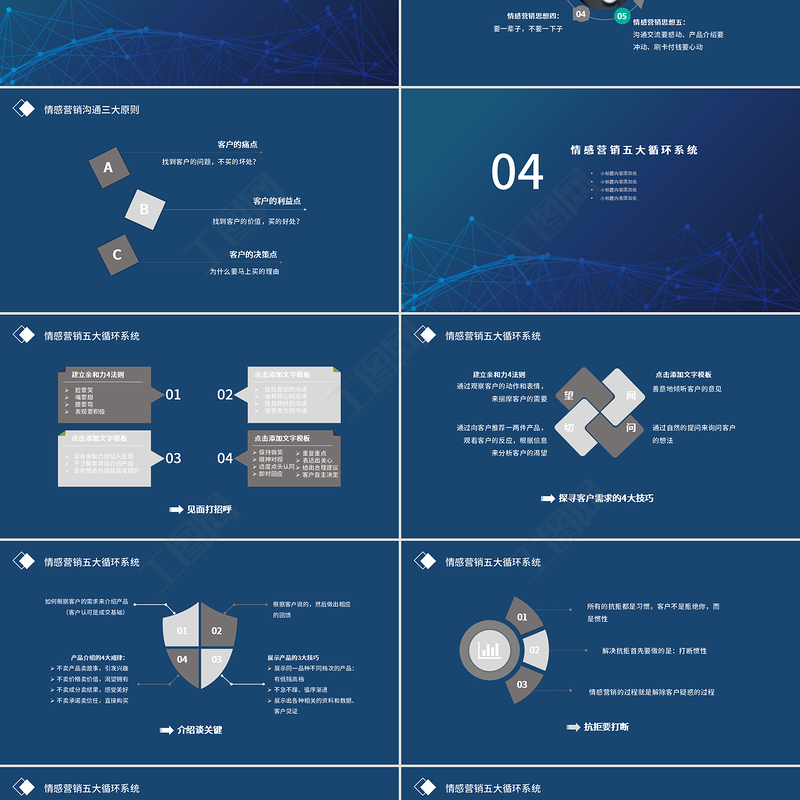 抗拒要打斷010203所有的抗拒都是習(xí)慣,客戶(hù)不是拒絕你,而是慣性解決抗拒首先要做的是:打斷慣性情感營(yíng)銷(xiāo)的過(guò)程就是解除客戶(hù)疑惑的過(guò)程情感營(yíng)銷(xiāo)五大循環(huán)系統(tǒng)