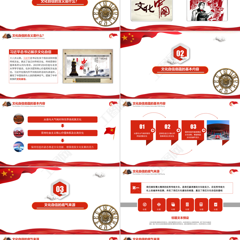 工圖網(wǎng)提供增強(qiáng)提升文化自信建設(shè)文化強(qiáng)國(guó)黨政風(fēng)政府黨課培訓(xùn)課件PPT模板供會(huì)員免費(fèi)下載。更多精彩黨課PPT素材,盡在工圖網(wǎng)。