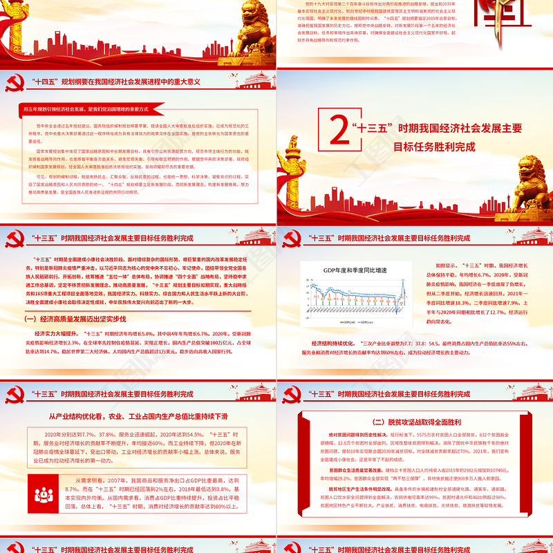 <p>學習貫徹“十四五”規劃綱要精神努力推動經濟社會高質量發展</p><br><p>前言 2021年是“十四五”規劃的開局之年。“十四五”時期是我國全面建成小康社會、實現第一個百年奮斗目標之后,乘勢而上開啟全面建設社會主義現代化國家新征程、向第二個百年奮斗目標進軍的第一個五年。黨的十九屆五中全會審議通過的《中共中央關于制定國民經濟和社會發展第十四個五年規劃和2035年遠景目標的建議》(以下簡稱《建議》),確定了“十四五”時期我國經濟社會發展的指導思想、目標任務和重大舉措,為編制《中華人民共和國國民經濟和社會發展第十四個五年規劃和2035年遠景目標綱要》(以下簡稱“十四五”規劃綱要)指明了方向、提供了遵循。2021年,十三屆全國人大四次會議審查通過“十四五”規劃綱要。“十四五”規劃綱要主要闡明國家戰略意圖、明確政府工作重點、引導規范市場主體行為,是我國開啟全面建設社會主義現代化國家新征程的宏偉藍圖。</p><br><p>目 錄CONTENTS</p><br><p>1“十四五”規劃綱要在我國經濟社會發展進程中的重大意義</p><br><p> 對于鞏固拓展全面建成小康社會和脫貧攻堅成果,開啟全面建設社會主義現代化國家新征程具有重大意義。新中國成立以來,從“一五”計劃到“十三五”規劃,我國一以貫之地朝著建設社會主義現代化國家的既定戰略目標分步實施、接力推進,在一窮二白基礎上迅速建立起比較完整的工業體系和國民經濟體系,人民生活實現了由解決溫飽到總體小康再到全面小康的歷史性跨越,實現了第一個百年奮斗目標。 黨的十九大對實現第二個百年奮斗目標作出分兩階段推進的戰略安排,提出到2035年基本實現社會主義現代化,到21世紀中葉把我國建成富強民主文明和諧美麗的社會主義現代化強國,明確了未來發展的路線圖和時間表。“十四五”規劃綱要錨定2035年遠景目標,準確把握我國發展的歷史方位,按照黨中央戰略安排,對新發展階段第一個五年的經濟社會發展目標、任務和舉措作出具體部署,對確保全面建設社會主義現代化國家開好局、起好步具有戰略導向和規范約束作用。“十四五”規劃綱要在我國經濟社會發展進程中的重大意義</p><br><p> 黨中央全會通過五年規劃建議、國務院組織編制規劃綱要草案、提請全國人大審查批準后組織實施,已成為規范化的工作程序。黨中央重大決策部署通過這一程序轉化成為具有法律效力的政策文件在全國實施,是黨的主張轉化為國家意志的重要途徑。 國家發展規劃集中體現了國家戰略意圖和中長期發展目標,具有引導公共資源配置方向、規范市場主體行為的功能,既發揮著戰略導向作用,也發揮著平衡各方面關系、避免宏觀失衡、引導和穩定預期的作用。根據黨中央的決策部署,政府組織編制國家發展規劃,經全國人大審查批準后依法依規組織實施,是政府履職盡責的重要依據。 可見,規劃的編制過程,既是發揚民主、匯聚眾智、反映民意的過程,也是統一思想、科學決策、凝聚共識的過程,實現了國家戰略意圖和人民共同意愿的統一。“十四五”規劃綱要立足新發展階段、貫徹新發展理念、構建新發展格局,努力推動高質量發展,是全國各族人民奮進新征程的共同行動綱領。“十四五”規劃綱要在我國經濟社會發展進程中的重大意義用五年規劃引領經濟社會發展,是我們黨治國理政的重要方式</p><br><p>2“十三五”時期我國經濟社會發展主要目標任務勝利完成</p><br><p> 經濟實力大幅提升。“十三五”時期經濟年均增長5.8%,其中前4年年均增長6.7%。2020年,受新冠肺炎疫情影響經濟增長2.3%,在全球率先控制住疫情蔓延、實現正增長,國內生產總值突破100萬億元,占全球比重達到14.7%,穩居世界第二大經濟體。人均國內生產總值超過1萬美元,穩步邁向高收入國家行列。“十三五”時期我國經濟社會發展主要目標任務勝利完成 “十三五”時期是全面建成小康社會決勝階段。面對錯綜復雜的國際形勢、艱巨繁重的國內改革發展穩定任務,特別是新冠肺炎疫情嚴重沖擊,以習近平同志為核心的黨中央不忘初心、牢記使命,團結帶領全黨全國各族人民砥礪前行、開拓創新,統籌推進“五位一體”總體布局,協調推進“四個全面”戰略布局,堅持穩中求進工作總基調,堅定不移貫徹新發展理念,推動高質量發展,“十三五”規劃主要目標如期實現,重大戰略任務和165項重大工程項目全面落地見效,我國經濟實力、科技實力、綜合國力和人民生活水平躍上新的大臺階,決勝全面建成小康社會取得決定性成就,中華民族偉大復興向前邁出了新的一大步。(一)經濟高質量發展邁出堅實步伐</p><br><p> 如圖顯示,“十三五”時期,我國經濟增長總體保持平穩,年均增長6.7%。2020年,受新冠肺炎疫情影響,我國經濟在一季度出現了負增長,但從二季度開始,經濟增長迅速回升。2021年一季度同比增速18.3%,二季度同比增速7.9%,上半年與2020年同期相比增長了12.7%,經濟運行趨向常態化。“十三五”時期我國經濟社會發展主要目標任務勝利完成 經濟結構持續優化。“三次產業比重調整為7.7:37.8:54.5,最終消費占國內生產總值比重達55%左右,服務業和消費對經濟增長的貢獻率均達到60%左右,成為拉動經濟增長的主要動力。</p><br><p>“十三五”時期我國經濟社會發展主要目標任務勝利完成 從需求側看,2007年,我國商品