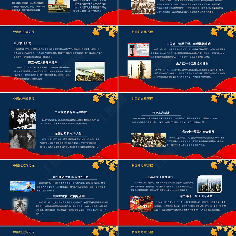 上海浦東開(kāi)發(fā)區(qū)建設(shè) 1990年4月18日,黨中央、國(guó)務(wù)院作出了開(kāi)發(fā)開(kāi)放上海浦東的重大決策,為改革開(kāi)放掀開(kāi)了新的一頁(yè)。經(jīng)過(guò)多年的艱苦創(chuàng)業(yè),上海浦東已經(jīng)成為上海現(xiàn)代化建設(shè)的縮影,更是中國(guó)改革開(kāi)放偉大成就的一個(gè)顯著標(biāo)識(shí)。舉辦第十一屆亞洲運(yùn)動(dòng)會(huì) 1990年9月22日至10月7日,第十一屆亞洲運(yùn)動(dòng)會(huì)在北京舉行。這是中國(guó)第一次承辦亞運(yùn)會(huì),也是中國(guó)承辦的第一鎰綜合性的國(guó)際體育大賽。在“團(tuán)結(jié)、友誼、進(jìn)步”的主旨下,來(lái)自亞洲37個(gè)國(guó)家和地區(qū)的體育代表團(tuán)共6578人參加了這屆運(yùn)動(dòng)會(huì)。中國(guó)的光輝歷程