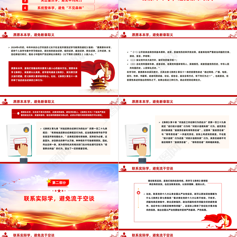 原原本本學,是我們黨推動有關(guān)要求入腦入心的基本方法。原原本本學《條例》,就是要認認真真、逐字逐句通讀《條例》,緊扣原文原義進行把握,把《條例》要求刻印在心。比如,《條例》第五十一條列舉了違反政治紀律的三種行為:原原本本學,避免斷章取義2024年4月初,中共中央辦公廳印發(fā)的《關(guān)于在全黨開展黨紀學習教育的通知》強調(diào):“要原原本本學,堅持個人自學與集中學習相結(jié)合,緊扣黨的政治紀律、組織紀律、廉潔紀律、群眾紀律、工作紀律、生活紀律進行研討,推動《中國共產(chǎn)黨紀律處分條例》(以下簡稱《條例》)入腦入心。”