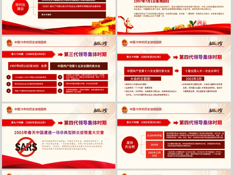 中國70年的歷史進程回顧第四代領導集體時期高舉**理論偉大旗幟全面貫徹“三個代表”重要思想繼往開來,與時俱進,全面建設小康社會,加快推進社會主義現代化,為開創中國特色社會主義事業新局面而奮斗。中國共產黨第十六次全國代表大會 十屆全國人大一次會議舉行選舉胡錦濤為國家主席,江zm為國家中央軍委主席,吳邦國為全國人大常委會委員長,曾慶紅為國家副主席,決定**為國務院總理