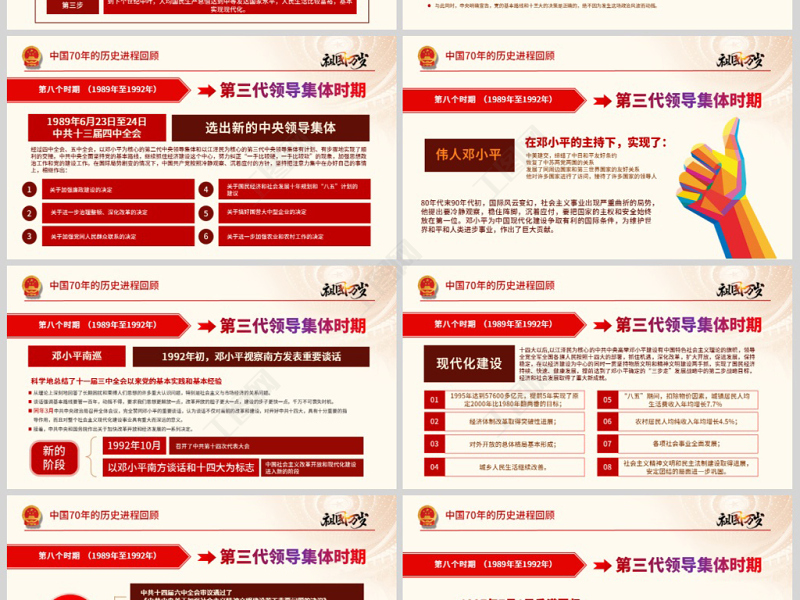中國70年的歷史進程回顧第三代領導集體時期經過四中全會、五中全會,以**為核心的第二代中央領導集體和以江zm為核心的第三代中央領導集體有計劃、有步驟地實現了順利的交接。中共中央全面堅持黨的基本路線,繼續抓住經濟建設這個中心,努力糾正“一手比較硬,一手比較軟”的現象,加強思想政治工作和黨的建設工作。在國際局勢劇變的情況下,中國共產黨按照冷靜觀察、沉著應付的方針,堅持把注意力集中在辦好自己的事情上,相繼作出:1234561989年6月23日至24日中共十三屆四中全會選出新的中央領導集體