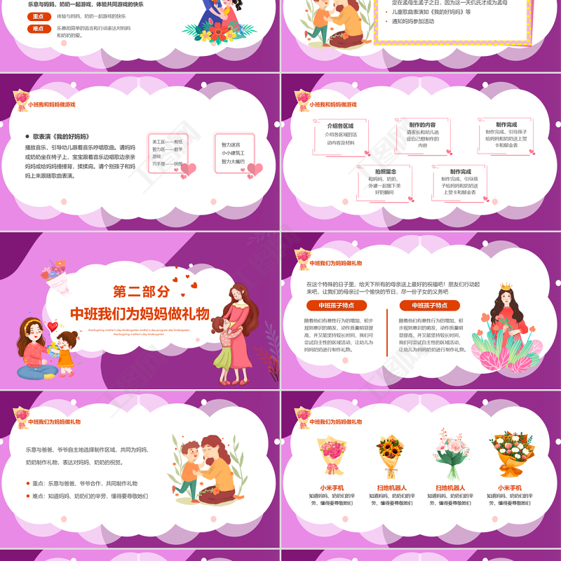 2022感恩母親節PPT紫色溫馨卡通風幼兒園感恩母親節活動方案課件模板