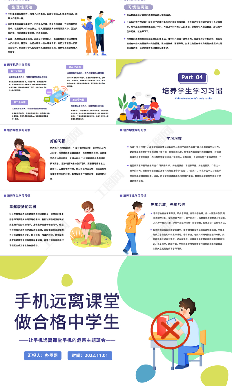 手機遠離課堂 做合格中學生——讓手機遠離課堂手機的危害主題班會——匯報人:辦圖網時間:2022.11.01