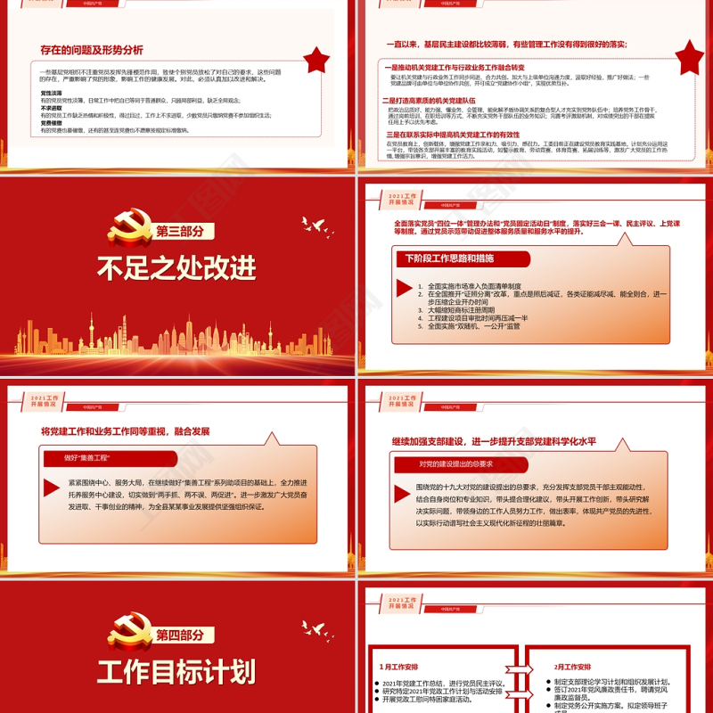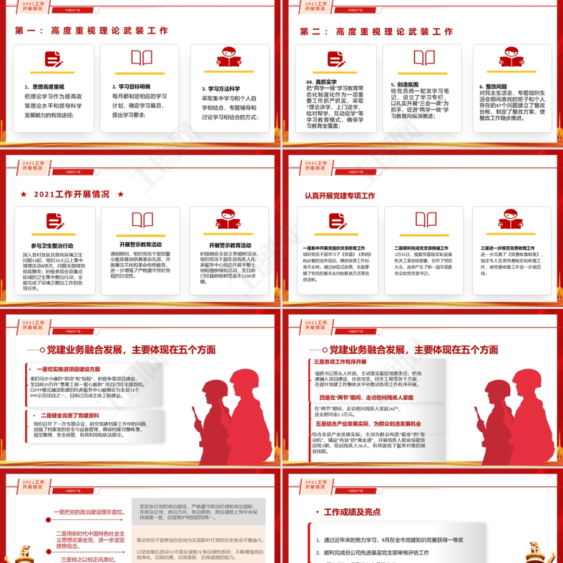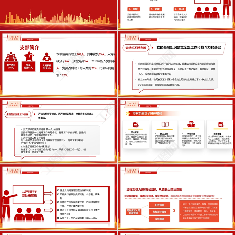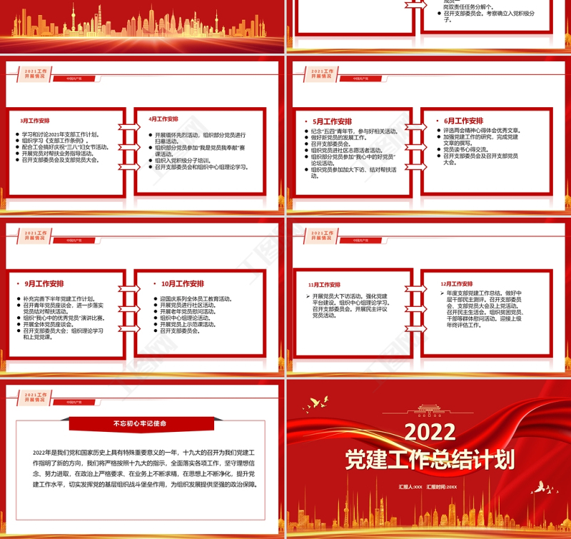 <p>匯報人:XXX 匯報時間:20XX2022黨建工作總結(jié)計劃</p><br><p>尊敬的各位領(lǐng)導、同志們: 2021年以來,我支部黨建工作堅持以黨的十九大精神為指導,牢牢抓住全面從嚴治黨、落實黨支部書記抓黨建工作主體責任這條主線,突出抓班子、帶隊伍、理思路、破難題工作思路,深入開展“兩學一做”常態(tài)化學習教育、服務(wù)型黨組織建設(shè)、黨建品牌打造等工作,為建設(shè)新時代“偉大事業(yè)” 提供了堅強的組織保證?,F(xiàn)將前階段工作匯報如下</p><br><p></p><br><p>年終工作概述</p><br><p>重點工作回顧2021工作開展情況</p><br><p>支部簡介本單位共有職工108人,其中黨員65人,入黨積極分子6人,預備黨員3人,2018年新入黨同志2人,黨員占到職工總?cè)藬?shù)的73%,比去年同期增長26%。職工總計108人黨員總計65人入黨積極分子6人2021工作開展情況</p><br><p>黨的基層組織是黨全部工作和戰(zhàn)斗力的基礎(chǔ),是團結(jié)帶領(lǐng)群眾貫徹黨的理論和路線方針政策、落實黨的任務(wù)的戰(zhàn)斗堡壘,長期以來在推動發(fā)展、服務(wù)群眾、凝聚人心、促進和諧中發(fā)揮了重要作用。截止2021年底,公司在某某本部和5個縣支公司基礎(chǔ)上共建立了2個聯(lián)合黨支部、2個縣支黨支部,基層黨組織建設(shè)比較完善。2021工作開展情況</p><br><p>全面落實黨建工作責任1. 黨支部書記落實抓黨建“第一人”的責任堅持每月召開一次黨建工作專題會議,黨建工作親自部署、黨建問題親自研究、黨建事項親自督辦。2. 實行黨建工作目標管理與55名黨員全部簽訂《黨員目標管理責任書》,明確了考核指標,把“軟任務(wù)”變成“硬指標” ;3. 制定了黨建工作安排和計劃制定了《2018年黨建工作安排》和一二季度《黨建工作計劃》,明確了重點、細化了任務(wù)。嚴格按照黨要管黨、從嚴治黨的要求,全面落實抓黨建主體責任。2021工作開展情況</p><br><p> 理論武裝堅持把理論武裝作為首要任務(wù),教育廣大黨員干部講政治、懂規(guī)矩,在思想上、行動上同縣委保持高度一致。 民主決策嚴格落實重大事項和重要活動請示報告制度,重大問題決策都由領(lǐng)導班子集體討論決策。 例會制度堅持每月召開一次開領(lǐng)導碰頭會和每周一次工作例會制度,確保決策的科學化、民主化和規(guī)范化。 狠抓落實全力抓好項目發(fā)展,積極參與,主動服務(wù),強化協(xié)調(diào),大力配合,保證政令暢通,確保各項方針政策貫徹落實。2021工作開展情況</p><br><p>從嚴抓好干部隊伍建設(shè)健全黨員黨性定期定性分析制度嚴格執(zhí)行發(fā)展黨員記實制、公示制、票決制堅持以嚴的標準要求干部、嚴的措施管理干部、嚴的紀律約束干部修訂《干部考勤及請銷假制度》和《績效考核辦法》雙管齊下,從嚴從實抓好干部隊伍建設(shè)2021工作開展情況</p><br><p>立足基本國情、遵循科技規(guī)律、堅持改革創(chuàng)新、加大對重點領(lǐng)域關(guān)鍵崗位重要環(huán)節(jié)的風險防控2021工作開展情況</p><br><p>第一:高度重視理論武裝工作思想高度重視把理論學習作為提高政策理論水平和領(lǐng)導科學發(fā)展能力的有效途徑;2. 學習目標明確每月都制定相應的學習計劃,確定學習篇目,提出學習要求;3. 學習方法科學采取集中學習和個人自學相結(jié)合,專題輔導和討論學習相結(jié)合的方式;2021工作開展情況</p><br><p>第二:高度重視理論武裝工作2021工作開展情況04. 真抓實學把“兩學一做”學習教育常態(tài)化制度化作為一項重要工作抓嚴抓實,采取“理論講學、上門送學、結(jié)對幫學、互動促學”等學習教育模式,確保學習教育全覆蓋;5. 創(chuàng)造氛圍給黨員統(tǒng)一配發(fā)學習筆記,設(shè)立了學習專欄,以扎實開展“三會一課”為抓手,促進“兩學一做”學習教育向縱深推進;6. 整改問題對民主生活會、專題組織生活會期間查找的班子和個人存在的47個問題建立了整改臺帳,制定了整改方案,使整改工作穩(wěn)步推進。</p><br><p>★ 2021工作開展情況 ★2021工作開展情況參與衛(wèi)生整治行動開展警示教育活動開展警示教育活動</p><br><p>2021工作開展情況認真開展黨建專項工作一是集中開展黨組織關(guān)系排查工作組織黨員干部學習了《黨章》《條例》和必要的業(yè)務(wù)培訓,確保排查工作標準不走樣。通過地毯式排查,全面掌握了黨員的基本去向和聯(lián)系方式等信息資料。二是順利完成黨支部換屆工作3月31日,根據(jù)黨章規(guī)定和縣直機關(guān)工委安排部署,召開了黨員大會,選舉產(chǎn)生了新一屆支部委員會和黨支部書記。三是進一步規(guī)范黨費收繳工作進一步完善了《黨費收繳制度》,指定專人負責黨費核定和收繳工作,使黨費收繳工作進一步規(guī)范化。</p><br><p>一是切實推進項目建設(shè)方面二是健全完善了黨建資料2021工作開展情況</p><br><p>三是各項工作有序開展四是在“兩節(jié)”期間,走訪慰問殘疾人家庭五是結(jié)合產(chǎn)業(yè)發(fā)展實際,為群眾創(chuàng)造發(fā)展機會2021工作開展情況</p><br><p>堅定執(zhí)行黨的政治路線,嚴格遵守政治紀律和政治規(guī)矩,在政治立場、政治方向、政治原則、政治道路上黨中央保持高度一致,自覺維護黨的團結(jié)統(tǒng)一。推動黨員干部更加自覺地為實現(xiàn)新時代黨的歷史使命不懈奮斗。以堅