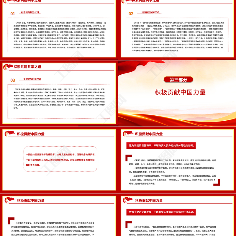 積極貢獻中國力量三是倡導共同安全、普遍安全理念,積極維護國際和平與安全,是派出聯合國維和人員最多的安理會常任理事國,為維護地區穩定、解決熱點問題發揮重要建設性作用。四是拓展全球伙伴關系網絡,運籌大國關系、推進大國協調和合作,按照親誠惠容理念和與鄰為善、以鄰為伴周邊外交方針深化同周邊國家關系,秉持正確義利觀和真實親誠理念加強同發展中國家團結合作。中國愿同各國加強溝通協調對話,妥善管控分歧風險,不斷增強和平力量和穩定力量,走出和平共處、合作共贏的國際關系新路。