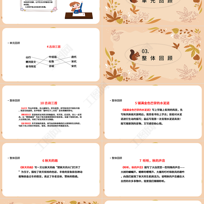 整體回顧 《山行》寫山中景致,詩人被吸引,停車欣賞。所寫秋景并不蕭條冷落,而是生機(jī)盎然,從中悟得“霜葉紅于二月花”富有理趣的警句。10 古詩三首 《贈劉景文》是送給好友劉景文的勉勵詩。先寫景,后議景。詩人一反常態(tài),以“橙黃橘綠”寫出了秋天碩果累累的豐收景象,顯露了勃勃生機(jī),給人以昂揚(yáng)之機(jī),也給了好友劉景文以勉勵。 《夜書所見》先寫深秋的凄清,再寫由深秋夜晚的燈火想到的生活場景,勾起了詩人對家鄉(xiāng)的追憶、留戀,更顯客居他鄉(xiāng)的孤寂無奈。