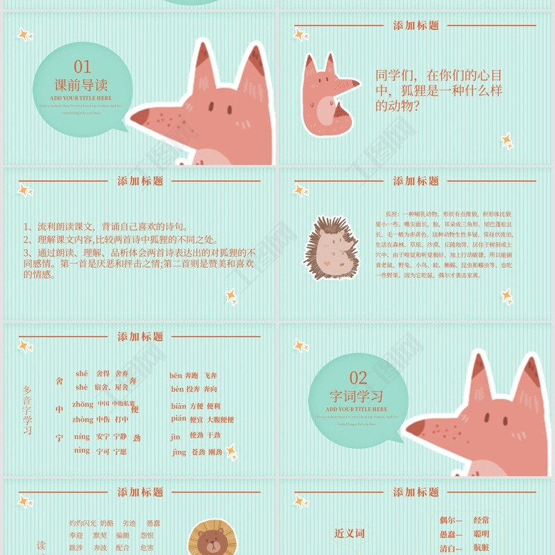 1、流利朗讀課文,背誦自己喜歡的詩句。 2、理解課文內容,比較兩首詩中狐貍的不同之處。 3、通過朗讀、理解、品析體會兩首詩表達出的對狐貍的不同感情。第一首是厭惡和抨擊之情;第二首則是贊美和喜歡的情感。