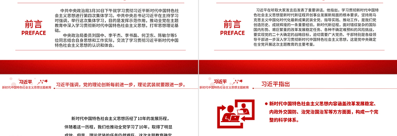 前言 PREFACE 中共中央政治局3月30日下午就學(xué)習(xí)貫徹習(xí)近平新時(shí)代中國(guó)特色社會(huì)主義思想進(jìn)行第四次集體學(xué)習(xí)。中共中央總書記習(xí)近平在主持學(xué)習(xí)時(shí)強(qiáng)調(diào),舉行這次集體學(xué)習(xí),目的是發(fā)揮示范作用,推動(dòng)全黨在主題教育中深入學(xué)習(xí)貫徹新時(shí)代中國(guó)特色社會(huì)主義思想,打牢思想理論基礎(chǔ)。 中央政治局委員劉國(guó)中、李干杰、李書磊、何衛(wèi)東、陳敏爾等5位同志結(jié)合自身思想和工作實(shí)際,交流了學(xué)習(xí)貫徹習(xí)近平新時(shí)代中國(guó)特色社會(huì)主義思想的認(rèn)識(shí)和體會(huì)。