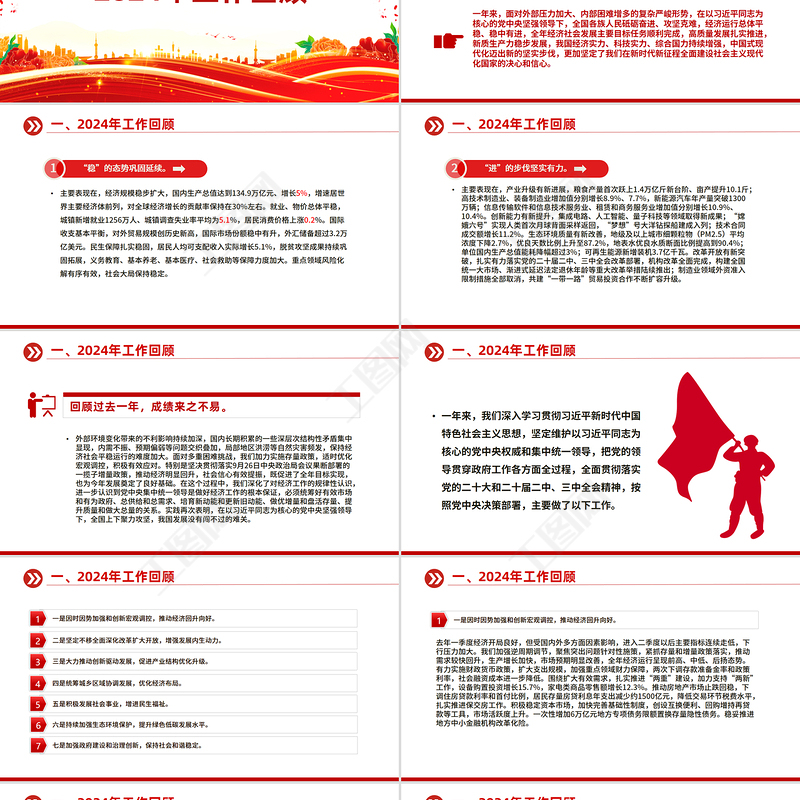一、2024年工作回顧一是因時因勢加強和創新宏觀調控,推動經濟回升向好。二是堅定不移全面深化改革擴大開放,增強發展內生動力。三是大力推動創新驅動發展,促進產業結構優化升級。四是統籌城鄉區域協調發展,優化經濟布局。五是積極發展社會事業,增進民生福祉。六是持續加強生態環境保護,提升綠色低碳發展水平。七是加強政府建設和治理創新,保持社會和諧穩定。