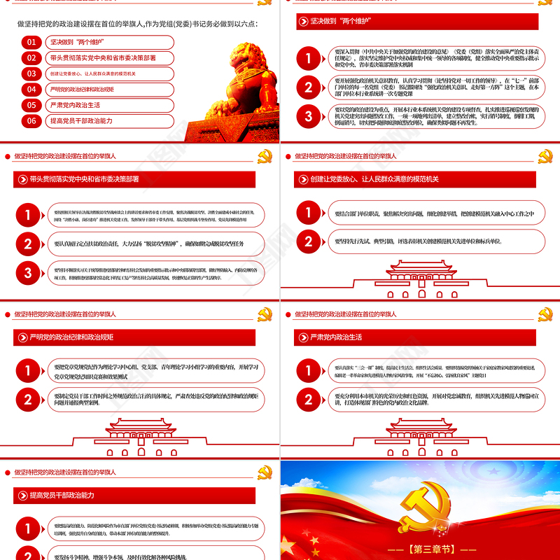 做準(zhǔn)確把握政治機(jī)關(guān)鮮明本色的明白人01做堅(jiān)持把黨的政治建設(shè)擺在首位的舉旗人02做篤學(xué)篤信篤行新時(shí)代中國(guó)特色社會(huì)主義思想的領(lǐng)頭人03做全面增強(qiáng)機(jī)關(guān)基層黨組織政治功能和組織力的推動(dòng)人04做持之以恒正風(fēng)肅紀(jì)反腐的嚴(yán)實(shí)人05做層層壓實(shí)全面從嚴(yán)治黨責(zé)任的履行人06