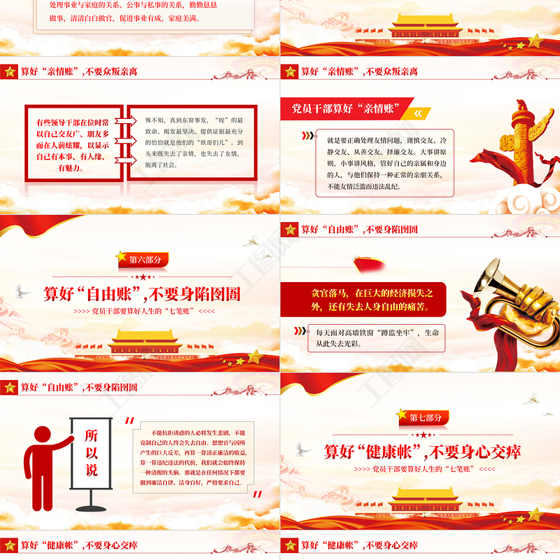 工圖網提供黨員干部要算好人生的“七筆賬”PPT紅色簡約風黨員干部學習教育專題黨課課件模板供會員免費下載。更多精彩黨課PPT素材,盡在工圖網。