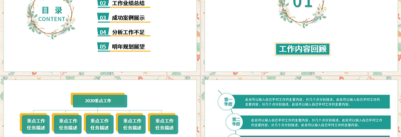 01 工作內(nèi)容回顧 02 工作業(yè)績(jī)總結(jié) 03 成功案例展示 04 分析工作不足 05 明年規(guī)劃展望 目錄CONTENT