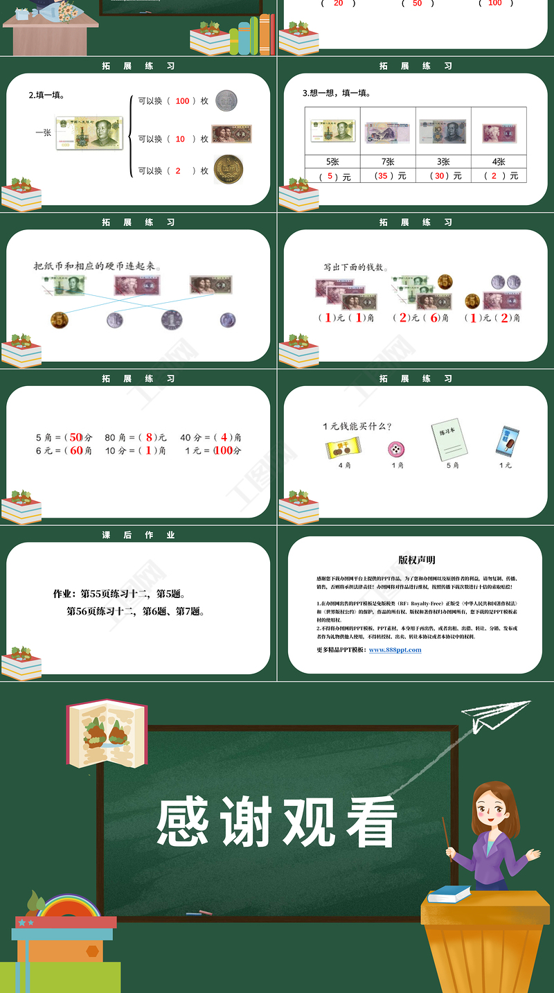 拓展練習2.填一填。一張可以換( )枚 可以換( )枚 可以換( )枚 100102