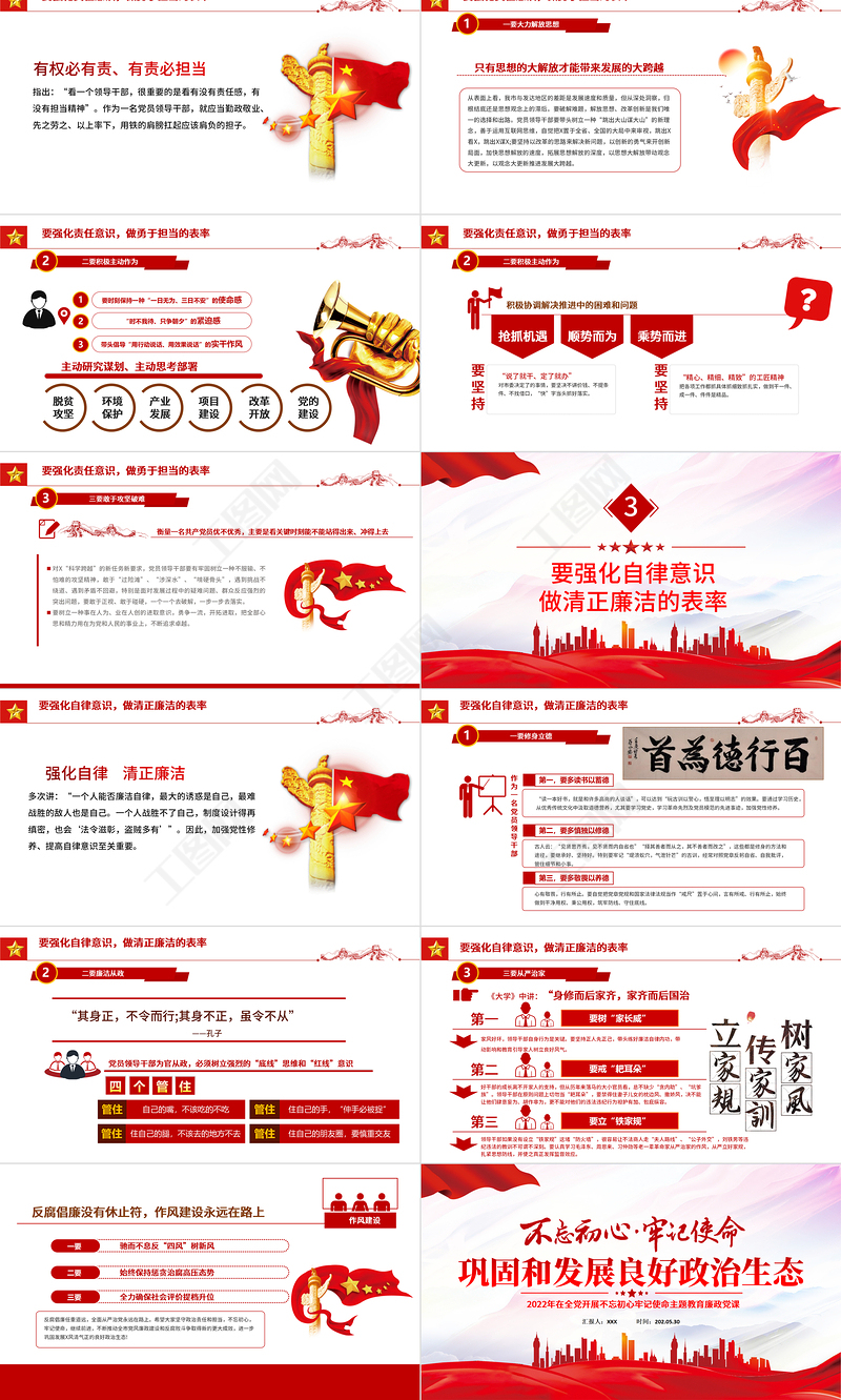 工圖網提供鞏固和發展良好政治生態PPT紅色黨政風2022年在全黨開展不忘初心牢記使命主題教育廉政黨課課件模板供會員免費下載。更多精彩黨課PPT素材,盡在工圖網。