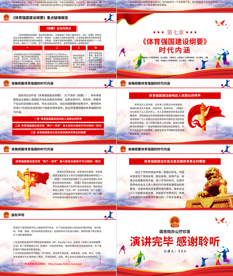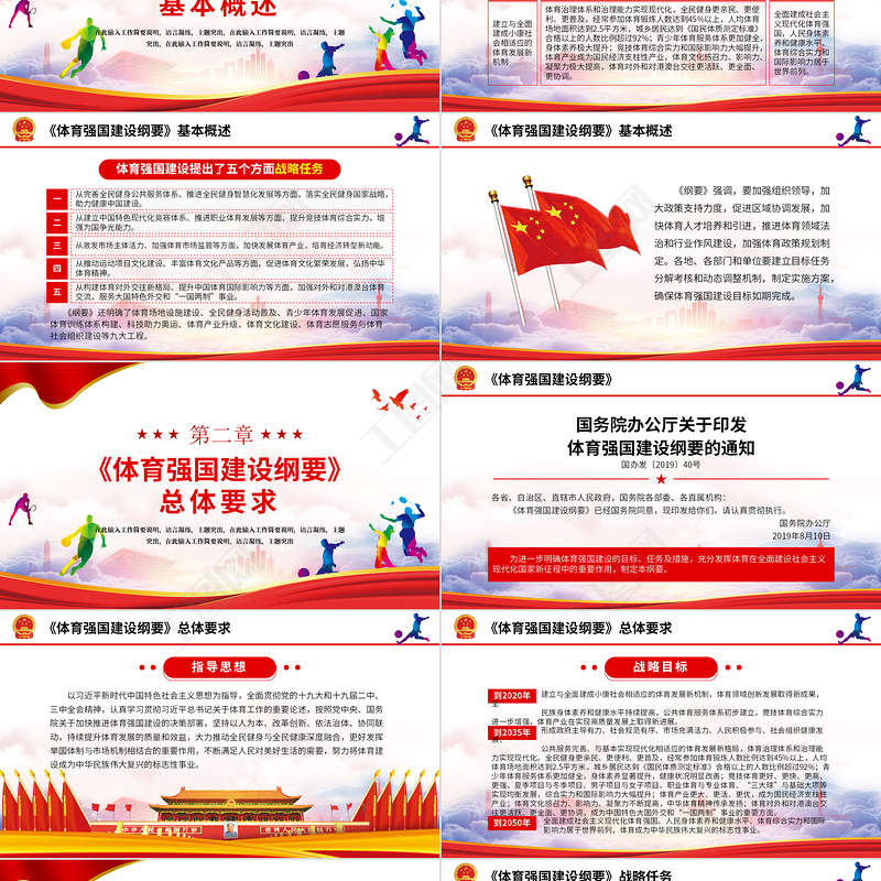 <p>宣講人:XXX體育強國建設綱要國務院辦公廳印發</p><br><p> 近日,國務院辦公廳印發《體育強國建設綱要》(以下簡稱《綱要》),部署推動體育強國建設,充分發揮體育在建設社會主義現代化強國新征程中的重要作用。前 言</p><br><p>目錄《體育強國建設綱要》基本概述《體育強國建設綱要》總體要求《體育強國建設綱要》戰略任務《體育強國建設綱要》政策保障《體育強國建設綱要》重大工程專欄《體育強國建設綱要》重點疑難解答準確把握體育強國的時代內涵</p><br><p>在此輸入工作簡要說明,語言凝練,主題突出,在此輸入工作簡要說明,語言凝練,主題突出,在此輸入工作簡要說明,語言凝練,主題突出《體育強國建設綱要》基本概述</p><br><p>《體育強國建設綱要》基本概述 《綱要》指出,要以習近平新時代中國特色社會主義思想為指導,按照黨中央、國務院關于加快推進體育強國建設的決策部署,堅持以人為本、改革創新、依法治體、協同聯動,持續提升體育發展的質量和效益,不斷滿足人民對美好生活的需要,努力將體育建設成為中華民族偉大復興的標志性事業。</p><br><p>《體育強國建設綱要》基本概述體育強國建設提出了五個方面戰略任務 《綱要》還明確了體育場地設施建設、全民健身活動普及、青少年體育發展促進、國家體育訓練體系構建、科技助力奧運、體育產業升級、體育文化建設、體育志愿服務與體育社會組織建設等九大工程。</p><br><p>《體育強國建設綱要》基本概述 《綱要》強調,要加強組織領導,加大政策支持力度,促進區域協調發展,加快體育人才培養和引進,推進體育領域法治和行業作風建設,加強體育政策規劃制定。各地、各部門和單位要建立目標任務分解考核和動態調整機制,制定實施方案,確保體育強國建設目標如期完成。</p><br><p>在此輸入工作簡要說明,語言凝練,主題突出,在此輸入工作簡要說明,語言凝練,主題突出,在此輸入工作簡要說明,語言凝練,主題突出《體育強國建設綱要》總體要求</p><br><p>《體育強國建設綱要》國務院辦公廳關于印發體育強國建設綱要的通知國辦發〔2019〕40號各省、自治區、直轄市人民政府,國務院各部委、各直屬機構: 《體育強國建設綱要》已經國務院同意,現印發給你們,請認真貫徹執行。國務院辦公廳 2019年8月10日 為進一步明確體育強國建設的目標、任務及措施,充分發揮體育在全面建設社會主義現代化國家新征程中的重要作用,制定本綱要。</p><br><p>《體育強國建設綱要》總體要求 以習近平新時代中國特色社會主義思想為指導,全面貫徹黨的十九大和十九屆二中、三中全會精神,認真學習貫徹習近平總書記關于體育工作的重要論述,按照黨中央、國務院關于加快推進體育強國建設的決策部署,堅持以人為本、改革創新、依法治體、協同聯動,持續提升體育發展的質量和效益,大力推動全民健身與全民健康深度融合,更好發揮舉國體制與市場機制相結合的重要作用,不斷滿足人民對美好生活的需要,努力將體育建設成為中華民族偉大復興的標志性事業。</p><br><p>《體育強國建設綱要》總體要求到2020年 建立與全面建成小康社會相適應的體育發展新機制,體育領域創新發展取得新成果,全 民族身體素養和健康水平持續提高,公共體育服務體系初步建立,競技體育綜合實力進一步增強,體育產業在實現高質量發展上取得新進展。到2035年 形成政府主導有力、社會規范有序、市場充滿活力、人民積極參與、社會組織健康發展、 公共服務完善、與基本實現現代化相適應的體育發展新格局,體育治理體系和治理能力實現現代化。全民健身更親民、更便利、更普及,經常參加體育鍛煉人數比例達到45%以上,人均體育場地面積達到2.5平方米,城鄉居民達到《國民體質測定標準》合格以上的人數比例超過92%;青少年體育服務體系更加健全,身體素養顯著提升,健康狀況明顯改善;競技體育更好、更快、更高、更強,夏季項目與冬季項目、男子項目與女子項目、職業體育與專業體育、“三大球”與基礎大項等實現均衡發展,綜合實力和國際影響力大幅提升;體育產業更大、更活、更優,成為國民經濟支柱性產業;體育文化感召力、影響力、凝聚力不斷提高,中華體育精神傳承發揚;體育對外和對港澳臺交往更活躍、更全面、更協調,成為中國特色大國外交和“一國兩制”事業的重要方面。到2050年全面建成社會主義現代化體育強國。人民身體素養和健康水平、體育綜合實力和國際影響力居于世界前列,體育成為中華民族偉大復興的標志性事業。</p><br><p>在此輸入工作簡要說明,語言凝練,主題突出,在此輸入工作簡要說明,語言凝練,主題突出,在此輸入工作簡要說明,語言凝練,主題突出《體育強國建設綱要》戰略任務</p><br><p>《體育強國建設綱要》戰略任務戰略任務</p><br><p>《體育強國建設綱要》戰略任務落實全民健身國家戰略,助力健康中國建設 充分發揮國務院全民健身工作部際聯席會議作用,地方各級政府建立全民健身工作聯席會議機制。緊緊圍繞便民惠民,抓好全民健身“六個身邊”工程建設。積極開展體育強省、全民運動健身模范市、全民運動健身模范縣三級聯創活動,逐步推動基本公共體育服務在地區、城鄉、行業和人群間的均等化。推動全民健身公共服務資源向農村傾斜,重點扶持革命老區、民族地區