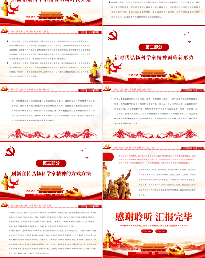 <p>——科學家精神是科技工作者在長期科學實踐中積累的寶貴精神財富——弘揚科學家精神應彰顯新時代特質主講:XXX時間:XXX</p><br><p>習近平總書記在科學家座談會上強調,科學成就離不開精神支撐。科學家精神是科技工作者在長期科學實踐中積累的寶貴精神財富。近年來,弘揚科學家精神引發了強烈反響,成為新時代做好人才工作的重要理念,標志著弘揚科學家精神迎來了新的春天。在新的春天里,科技界和全社會應堅持守正創新、固本謀遠,進一步將科學家精神發揚光大,為實現中華民族偉大復興提供強大精神力量。前 言</p><br><p></p><br><p>第一部分不斷拓展科學家精神的新時代外延</p><br><p>在黨的百年奮斗歷史長河中,一代代科學家接續奮斗,在鑄就輝煌成就的同時形成了“愛國、創新、求實、奉獻、協同、育人”的精神內核。科學家精神不是僵化和封閉的,在新時代必將隨著實踐發展而不斷深化和拓展。——開放精神。當前科學家應主動適應新一輪高水平對外開放的新形勢,立足全球視野,積極融入全球創新網絡,牽頭組織國際大科學計劃和大科學工程,推動國際科技組織總部和重要分支機構落戶中國,推動中外科學家在國際、國內學術組織雙向任職,全方位提升我國科技界對外開放水平,讓開放成為中國科學家鮮明的精神標識。不斷拓展科學家精神的新時代外延</p><br><p>——卓越精神。在百年變局和疫情交織疊加的大背景下,科技創新成為了大國戰略競爭的焦點。突破關鍵核心技術,實現創新鏈、產業鏈自主可控、安全穩定,是以科技助推構建新發展格局的戰略抉擇,這需要廣大科技工作者特別是科學家付出艱苦卓絕的努力。科學家要永無止境地攀登科學高峰,以卓越的成就和業績,推動我國科技發展從跟跑、并跑更多的轉向領跑,搶占引領全球發展的科技戰略制高點,讓卓越成為中國科學家重要的精神追求。——向善精神。科技是一把雙刃劍,用之善則造福人類社會,用之惡則貽害無窮,深刻影響著世界人民前途命運、生活福祉。科學家應秉持科技向善理念,深度參與全球科技治理,攜手應對生命健康、氣候變化、糧食和能源安全等人類共同挑戰,以科技的力量推動構建人類命運共同體,讓永無止境的科技創新止于至善。不斷拓展科學家精神的新時代外延</p><br><p>第二部分新時代弘揚科學家精神面臨新形勢</p><br><p>新一輪科技革命和產業變革倒逼科研范式發生深刻變化,這也為弘揚科學家精神帶來了新的形勢。傳統舉國體制以其強大的組織保障和動員能力,為科技工作者發揮主觀能動性、踐行科學家精神提供了外部約束和目標督促。而以市場配置資源為主的新型舉國體制,給了科技工作者相對寬松、自由的環境和條件,也對其精神自律、自我約束提出了更高要求,弘揚踐行科學家精神的迫切現實意義更加彰顯。新時代弘揚科學家精神面臨新形勢</p><br><p>對于從事基礎研究的科技工作者,往往“板凳甘坐十年冷”;對于從事應用研究的科技工作者,成果轉化中的知識產權保護可能還存在一些不足;對于從事前沿性、公益性研究的科技工作者,靈活的薪酬制度、科研保障條件等可能尚未完全落地;加之“破四唯”后“立新標”尚在不斷探索,人才評價指揮棒作用和激勵效能有待充分發揮……科技工作者在科研生態環境有待進一步改善的情況下,其堅定執著的知難負重、勇毅前行,更加離不開科學家精神的有力支撐。新時代弘揚科學家精神面臨新形勢</p><br><p>第三部分創新宣傳弘揚科學家精神的方式方法</p><br><p>堅持弘揚科學家精神,在中央人才工作會議上成為了新時代做好人才工作的重要理念,這標志著弘揚科學家精神從科技界拓展到了全社會,也對其宣傳和弘揚提出了新的任務和要求。應充分考慮不同受眾群體特點,分類并精準施策,將科學家精神功能價值發揮到最大化。——面向科技工作者。面向科技工作者弘揚科學家精神,應引領其深刻理解精神內核,厚植家國情懷,把握主基調、主旋律。向他們宣傳戰略科學家、科學大師的事跡,引領他們深入挖掘其學術思想、人生積累,給其自身科研工作以啟迪啟示。同時,要通過弘揚科學家精神引領廣大科技工作者加強作風學風建設,營造風清氣正的科研環境。創新宣傳弘揚科學家精神的方式方法</p><br><p>創新宣傳弘揚科學家精神的方式方法——面向廣大人才。面向廣大人才弘揚科學家精神,應加強對他們的思想引領,進一步增強他們的價值認同,激發他們建功立業新時代的決心和信心。同時,通過展現科學家學術成長歷程,向廣大人才宣傳科學文化和科學價值理念,傳播科學思想、倡導科學方法;通過探尋科學家心路歷程、人格養成,以精神和情感的共鳴激勵廣大人才不慕虛榮、浮華,以專注和勤奮探索形成自身專業、領域優勢,在本職崗位上努力做出非凡的業績。——面向青少年。面向青年弘揚科學家精神,要充分理解青年開放、包容、多元的價值體系。“干驚天動地事、做隱姓埋名人”式的弘揚,反而會使他們與科技漸行漸遠。在宣傳科學家社會價值的同時,應注重體現其個人價值,為青年清晰勾勒投身科學職業的成長路徑、發展預期,讓青年充分認識科學家的職業優勢、條件保障、社會支持,意識到科學家在成全光輝大我的同時亦能成就燦爛小我,以此進一步激發青年立志成為科學家的內生動力。面向少年