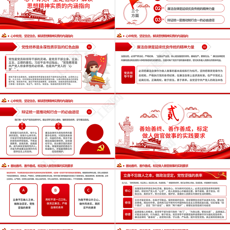 心中有黨、堅定信念,解讀思想精神實質的內涵指向辯證統一是推動知行合一的必由途徑我們每一名共產黨員在新時代,都必須牢記初心使命、錘煉黨性修養、堅守廉潔底線。思想是行動的先導,有什么樣的黨性,就有什么樣作風,只有堅守黨性原則進行長期的黨性修養和鍛煉,不斷自我教育、自我完善、自我提高,成為具有堅強黨性的人,才能為養成廉潔自律的作風提供信念上的支持。廉潔自律作為黨性修養的重要外在表現,對黨性具有保護、鞏固的作用,黨員干部都應加強紀律修養、自覺遵紀守法,充分展示黨的良好形象,增強黨組織的感召力和凝聚力,才能贏得群眾的信任和擁護。0102
