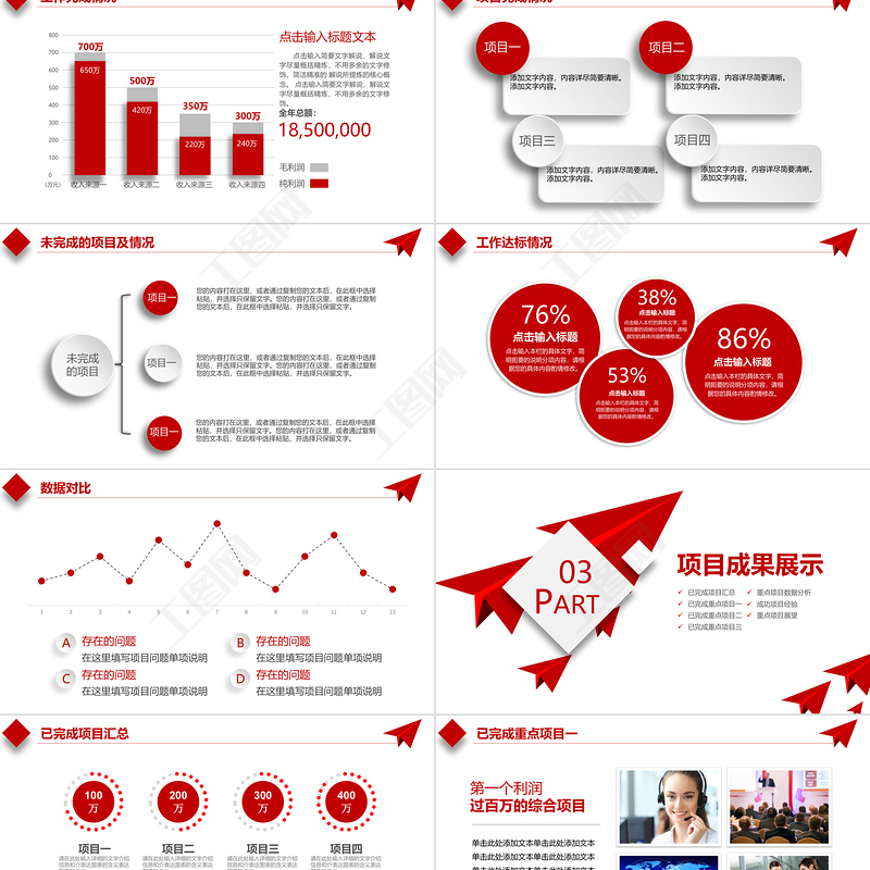 年終總結(jié) 新年計劃 述職報告 工作匯報 年中工作總結(jié) LOGO Four short words sum up what has lifted most successful individuals above the crowd: a little bit more. 匯報人:某某某 時間:2025.12.09 2 0 2 6 前言 歲月流轉(zhuǎn),時光飛逝,轉(zhuǎn)眼間2023年的工作又接近尾聲。 回首過去一年的工作,經(jīng)過全體領(lǐng)導(dǎo)及員工的共同努力,公司 經(jīng)營業(yè)績保持良好,行業(yè)地位、社會形象日漸提升,各項(xiàng)工作全面發(fā) 展。今年,面對經(jīng)濟(jì)下行所帶來的影響,公司上下團(tuán)結(jié)一致,奮力拼 搏,打了一場漂亮的安全效益翻身仗。我們不僅在上半年實(shí)現(xiàn)了扭虧 為贏,而且全年銷售收入突破了3億元,標(biāo)志著公司邁上了一個新臺 階,步入了一個新的發(fā)展階段。 新起點(diǎn)、新希望。站在2024年的起點(diǎn),我們將繼承和發(fā)揚(yáng)過去 工作中存在的優(yōu)點(diǎn),汲取經(jīng)驗(yàn),摒棄不足,滿懷信心,以更清醒的頭 腦、更旺盛的斗志、更奮發(fā)的姿態(tài)和更充沛的干勁,向我們的既定目 標(biāo)進(jìn)發(fā)! 目錄 CONTENTS 1 半年工作概述 2 工作完成情況 3 項(xiàng)目成果展示 4 工作不足之處 5 下步工作計劃 01 PART 半年工作概述 ü 上半年工作概況 ü 上半年工作大事件 ü 重點(diǎn)工作回顧 ü 團(tuán)隊建設(shè)情況 上半年工作概況 請在此處輸入您的文本或者復(fù)制您的文本粘貼到此處,請在此處輸入您的文本或者復(fù)制您的文本粘貼到此處。請在此 處輸入您的文本或者復(fù)制您的文本粘貼到此處,請在此處輸入您的文本或者復(fù)制您的文本粘貼到此處。 單擊添加文本單擊添加文本 單擊添加文本單擊添加文本 單擊添加文本單擊添加文本 單擊添加文本單擊添加文本 單擊添加文本單擊添加文本 單擊添加文本單擊添加文本 單擊添加文本單擊添加文本 單擊添加文本單擊添加文本 上半年工作大事件 時間段1 時間段2 時間段3 時間段4 時間段5 事件一 這里輸入人員的 工作安排這里輸 入人員的工作安 排這里輸入人員 的工作安排這里 輸入人員的工作 安排 事件二 這里輸入人員的 工作安排這里輸 入人員的工作安 排這里輸入人員 的工作安排這里 輸入人員的工作 安排 事件三 這里輸入人員的 工作安排這里輸 入人員的工作安 排這里輸入人員 的工作安排這里 輸入人員的工作 安排 事件四 這里輸入人員的 工作安排這里輸 入人員的工作安 排這里輸入人員 的工作安排這里 輸入人員的工作 安排 事件五 這里輸入人員的 工作安排這里輸 入人員的工作安 排這里輸入人員 的工作安排這里 輸入人員的工作 安排 重點(diǎn)工作回顧 這里輸入簡單的文字概述這里輸入 簡單文字概述簡單的文字概述。 這里填寫小標(biāo)題 這里輸入簡單的文字概述這里輸入 簡單文字概述簡單的文字概述。 這里填寫小標(biāo)題 這里輸入簡單的文字概述這里輸入 簡單文字概述簡單的文字概述。 這里填寫小標(biāo)題 這里輸入簡單的文字概述這里輸入 簡單文字概述簡單的文字概述。 這里填寫小標(biāo)題 這里輸入簡單的文字概述這里輸入 簡單文字概述簡單的文字概述。 這里填寫小標(biāo)題 這里輸入簡單的文字概述這里輸入 簡單文字概述簡單的文字概述。 這里填寫小標(biāo)題 團(tuán)隊建設(shè)情況 輸入 相關(guān)標(biāo)題 這里輸入簡單的文字概述這里輸入簡單 文字概述簡單的文字概述這里輸入簡單 的文字概述這里輸入簡單 輸入相關(guān)標(biāo)題 這里輸入簡單的文字概述這里輸入簡單 文字概述簡單的文字概述這里輸入簡單 的文字概述這里輸入簡單 輸入相關(guān)標(biāo)題 02 PART 工作完成情況 ü 已完成的工作 ü 已完成的項(xiàng)目及情況 ü 工作完成情況 ü 項(xiàng)目完成情況 ü 未完成的項(xiàng)目及情況 ü 工作達(dá)標(biāo)情況 ü 數(shù)據(jù)對比 已完成的工作 01 02 03 點(diǎn)擊輸入簡要文字內(nèi)容,文字內(nèi)容需概 括精煉,不用多余的文字修飾,言簡意 賅的說明分項(xiàng)內(nèi)容……。 點(diǎn)擊輸入簡要文字內(nèi)容,文字內(nèi)容需概 括精煉,不用多余的文字修飾,言簡意 賅的說明分項(xiàng)內(nèi)容……。 點(diǎn)擊輸入簡要文字內(nèi)容,文字內(nèi)容需概 括精煉,不用多余的文字修飾,言簡意 賅的說明分項(xiàng)內(nèi)容……。 已完成的工作 項(xiàng)目的背景介紹在這段 文字中錄入,根據(jù)你所 錄入的文字內(nèi)容多少對 字號的大小進(jìn)行更改, 切忌長篇大論。 已完成的項(xiàng)目及情況 點(diǎn)擊添加描述總結(jié) 點(diǎn)擊添加描述總結(jié) 點(diǎn)擊添加描述總結(jié) 點(diǎn)擊添加描述總結(jié) 項(xiàng)目主要情況 在此錄入上述圖表的綜合描述說明,在此 錄入上述圖表的綜合描述說明,在此錄入 上述圖表的綜合描述說明,在此錄入上述 圖表的綜合描述說明,在此錄入上述圖表 的綜合描述說明。 項(xiàng)目二 項(xiàng)目一 項(xiàng)目三 項(xiàng)目四 工作完成情況 收入來源一 100 收入來源二 收入來源三 收入來源四 200 300 400 500 600 700 800 0 點(diǎn)擊輸入簡要文字解說,解說文 字盡量概括精煉,不用多余的文字修 飾,簡潔精準(zhǔn)的 解說所提煉的核心概 念。 點(diǎn)擊輸入簡要文字解說,解說文 字盡量概括精煉,不用多余的文字修 飾。 點(diǎn)擊輸入標(biāo)題文本 18,500,000