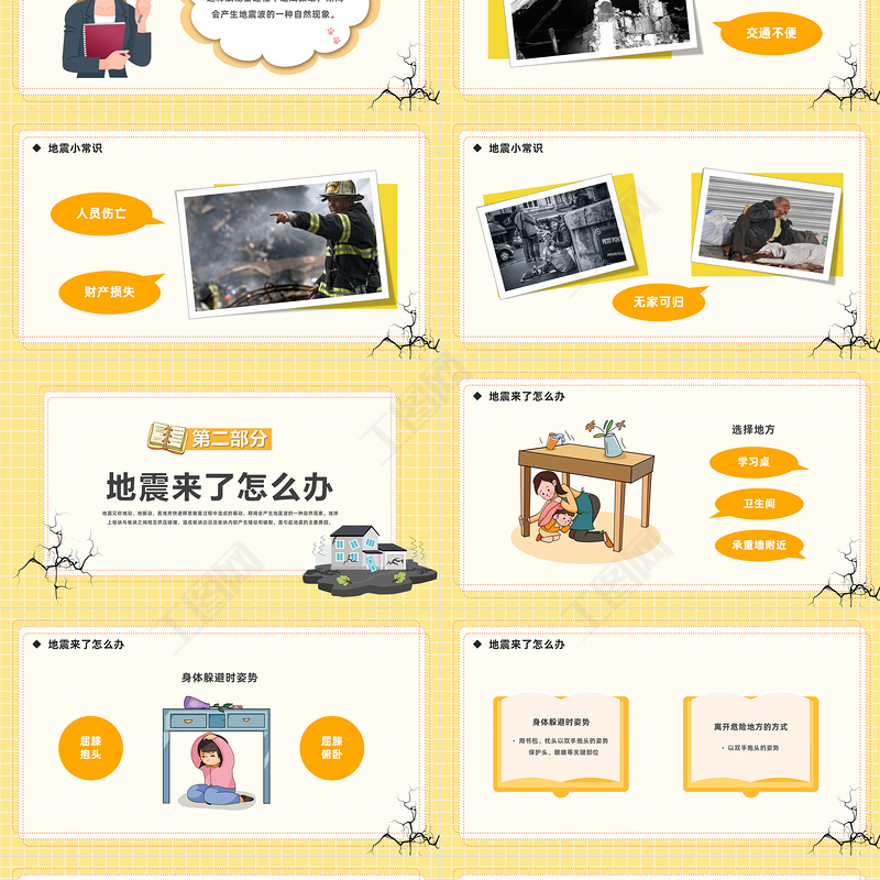 2023防震減災安全童行PPT卡通風幼兒園防震知識科普與演練主題班會課件模板下載