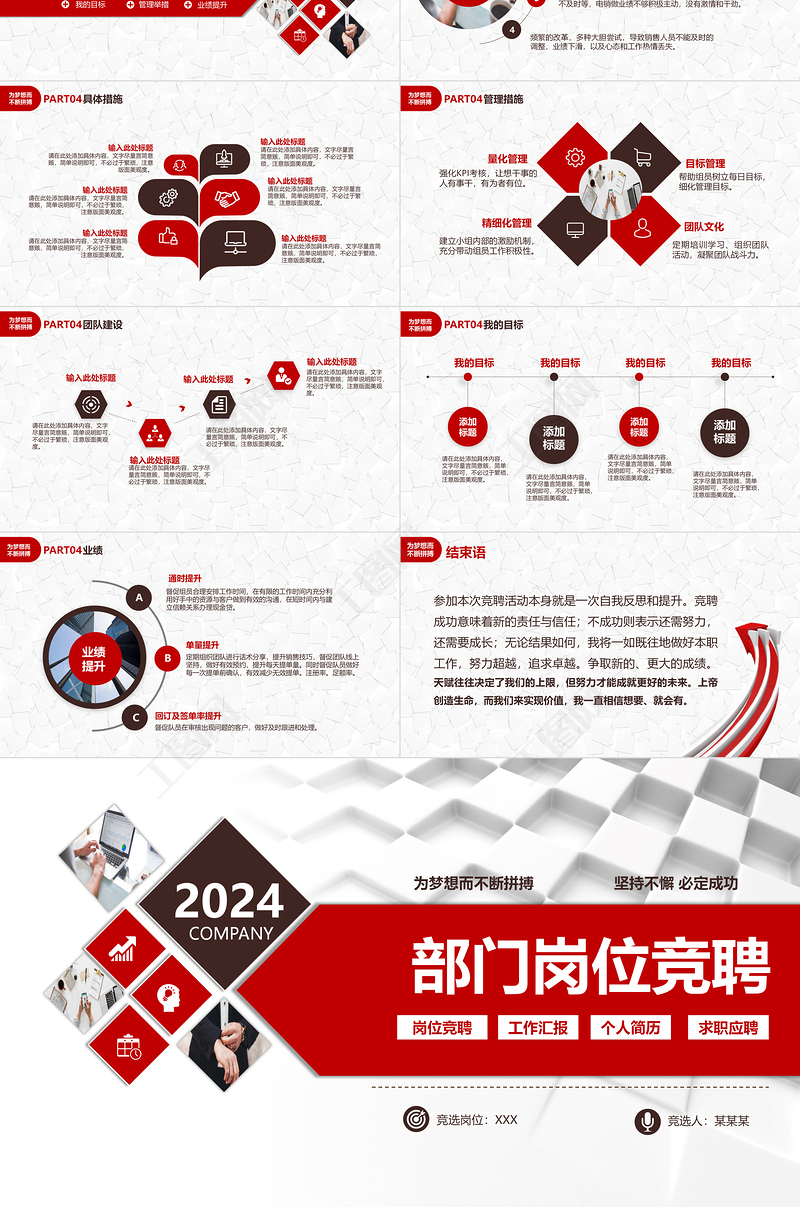 部門崗位競聘競選崗位:XXX競選人:某某某為夢想而不斷拼搏 堅持不懈 必定成功COMPANY2024崗位競聘 工作匯報個人簡歷求職應聘