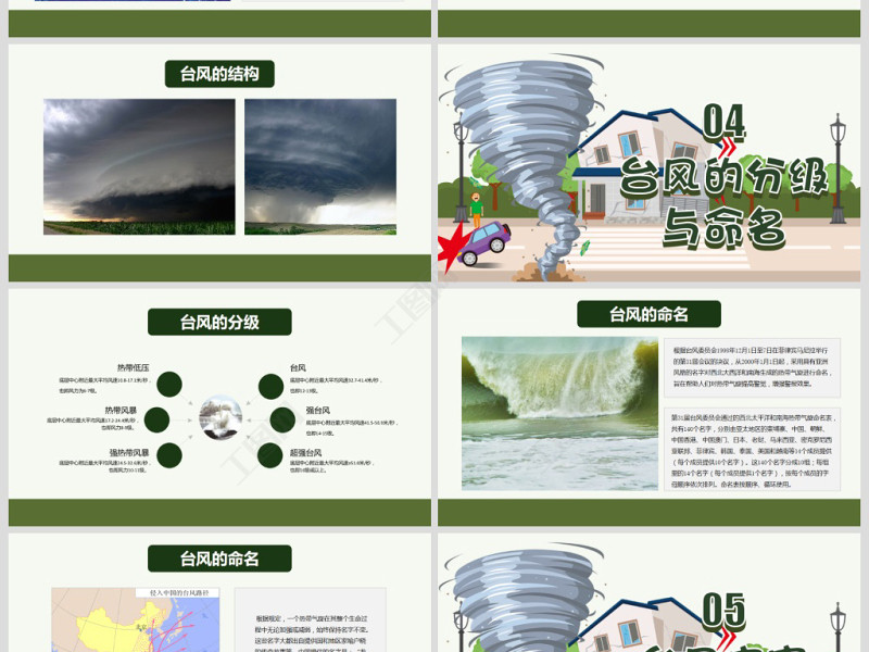 <p>防洪抗汛防臺風</p><br><p>目錄contens</p><br><p>01臺風的概念</p><br><p>臺風是熱帶氣旋的一種。 氣象學上,臺風專指北太平洋西部(國際日期線以西,包括南中國海)洋面上發生,近中心最大持續風速達到12級及以上(即每秒32.7米以上)的熱帶氣旋。至于在大西洋或北太平洋東部發生,達到同樣強度的熱帶氣旋,則稱為颶風。臺風的概念</p><br><p>颶風中國習慣稱為“臺風”或“熱帶風暴”颶風臺風的概念</p><br><p>02臺風的形成</p><br><p>要有廣闊的高溫、高濕的大氣。要有低層大氣向中心輻合、高層向外擴散的初始擾動。要有足夠大的地轉偏向力作用,地球自轉作用有利于氣旋性渦旋的生成。垂直方向風速不能相差太大,上下層空氣相對運動很小,才能使初始擾動中水汽凝結所釋放的潛熱能集中保存在臺風眼區的空氣柱中,形成并加強臺風暖中心結構。產生具備特有的條件臺風的形成</p><br><p>臺風的形成</p><br><p>03臺風的結構</p><br><p> 臺風中心的臺風眼呈圓形或橢圓形,該處氣壓最低,溫度最高,因盛行下沉氣流,因此碧空無云,風和日麗,天氣晴朗。其直徑平均為25千米,大的可達60—70千米。臨其境的海員把臺風眼稱為臺風中的“世外桃源”。 臺風眼的周圍是云墻區,平均直徑為200千米在此空氣急速旋轉,是臺風中天氣最惡劣的地區,凡摧毀性的大風、暴雨均集中于此,成為破壞力最強的地帶,因此,臺風警報中,總是預報臺風中心附近最大風力,而不說“臺風中心最大風力”。臺風的結構</p><br><p>臺風云系臺風的結構</p><br><p>臺風的結構</p><br><p>04臺風的分級與命名</p><br><p>臺風的分級</p><br><p>臺風的命名根據臺風委員會1998年12月1日至7日在菲律賓馬尼拉舉行的第31屆會議的決議,從2000年1月1日起,采用具有亞洲風格的名字對西北大西洋和南海生成的熱帶氣旋進行命名,旨在幫助人們對熱帶氣旋提高警覺,增強警報效果。第31屆臺風委員會通過的西北太平洋和南海熱帶氣旋命名表,共有140個名字,分別由亞太地區的柬埔寨、中國、朝鮮、中國香港、中國澳門、日本、老撾、馬來西亞、密克羅尼西亞聯邦、菲律賓、韓國、泰國、美國和越南等14個成員提供(每個成員提供10個名字)。這140個名字分成10組;每組里的14個名字(每個成員提供1個名字),按每個成員的字母順序依次排列。命名表按順序、循環使用。</p><br><p>臺風的命名 根據規定,一個熱帶氣旋在其整個生命過程中無論加強或減弱,始終保持名字不變。這些名字大都出自提供國和地區家喻戶曉的傳奇故事等。中國提供的名字是:“龍王”、“玉兔”、“風神”、“杜鵑”、“海馬”、“悟空”、“海燕”、“海神”、“電母”和“海棠”。 </p><br><p>05臺風災害</p><br><p> 世界氣象組織專家統計記表明:威脅人類生存的10大類自然災害有臺風、地震、洪水、雷暴、龍卷風、雪暴、雪崩、火山爆發、熱浪、山體滑坡(泥石流)和海潮(海嘯)。而臺風是造成死亡人數最多的災害,尤其在亞洲和中國。臺風具有突發性強、破壞力大的特點。 臺風災害</p><br><p>據世界氣象組織的報告,全球每年死于熱帶風暴的人數約為2000—3000人。據有關資料,西太平洋沿岸國家平均每年因臺風造成的經濟損失為40億美元。我國也是一個臺風災害嚴重的國家(每年平均8個臺風登陸我國)。臺風災害的主要形式:強風、暴雨和風暴潮 臺風災害</p><br><p>強風</p><br><p>暴雨、水災</p><br><p>風暴潮</p><br><p>06臺風的預防</p><br><p>臺風的預防 對臺風,利用衛星和雷達監視其強度、方向和速度,及時發布臺風預報警報,同時加強國際合作。</p><br><p>臺風的預防在科技不發達的年代,由于海洋的范圍大,無法監測到臺風的生成及移動,往往要等到臺風靠近船舶和陸地后,才發覺它的存在。20世紀60年代氣象衛星投入使用之后,每一個臺風的發生、發展,特別是它的移動路徑就完全逃不過衛星的眼睛,從那時起,氣象部門就沒有漏測、漏報過一次臺風的消息。 先進的衛星遙感技術為臺風的觀測和預報提供了極大的幫助,從1980年以來,對在我國登陸的臺風,氣象部門基本上都能做出正確的臺風預報。隨著衛星遙感、雷達探測及數值預報技術的發展,臺風的監測預報水平將會更上一層樓,臺風路徑將在人們的掌握之中。</p><br><p>臺風藍色預警信號藍色警報:需注意標準: 24小時內可能或者已經受熱帶氣旋影響,沿海或者陸地平均風力達6級以上,或者陣風8級以上并可能持續。或指24小時內可能受熱帶低壓影響,平均風力可達6級(風速10.8米/秒-13.8米/秒)以上,或陣風7級(風速13.9米/秒-17.1米/秒)以上;其物狀是電線呼嘯有聲,行人迎風行走感覺不便。防御指南:1.政府及相關部門按照職責做好防臺風準備工作;2.停止露天集體活動和高空等戶外危險作業;3.相關水域水上作業和過往船舶采取積極的應對措施,如回港避風或者繞道航行等;4.加固門窗、圍板、棚架、廣告牌等易被風吹動的搭建物,切斷危險的室外電源。</p><br><p>臺風藍色預警信號橙色警報:需躲避標準:12小時內可能或者已經受熱帶氣旋影響,沿海或者陸地平均風力達10級以上,或者陣風12級以上并可能持續。或指12小時內可能受強熱帶風暴影響,平均風力可達10級(風速24.5米/秒-28.4米/秒)以上,或陣風11級(風速28.5米/秒-32.6米/秒)以上;此時樹木可被摧倒,出行危險性很大。防御指南:1. 做好防臺風應急準備工作;2.停止室內外大型集會和高空等戶外危險作