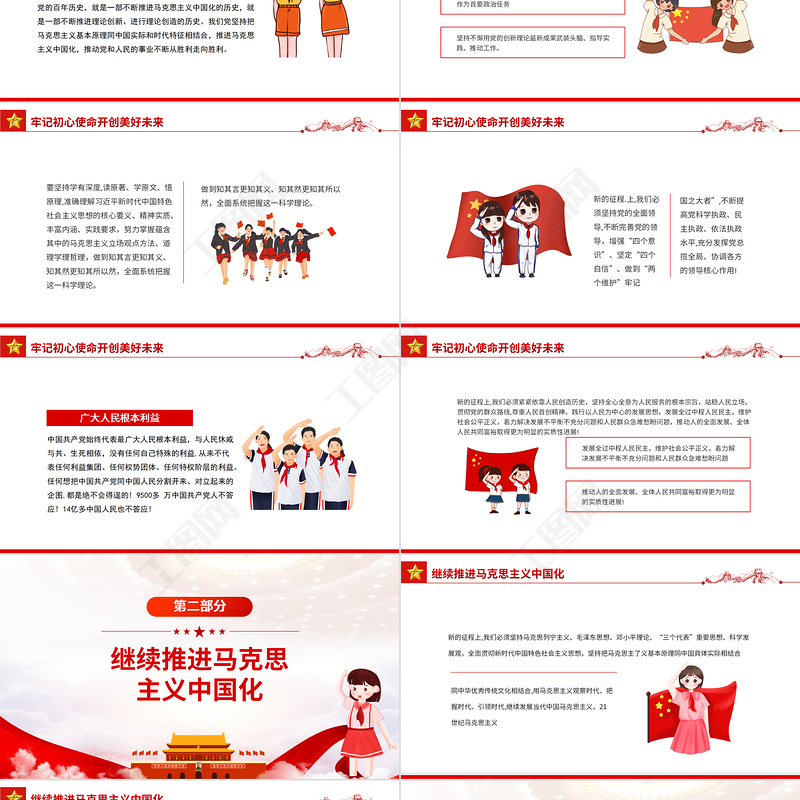 <p>技能成才·強國有我</p><br><p>目錄</p><br><p>第一部分牢記初心使命開創美好未來</p><br><p>要教育引導全黨從黨的非凡歷程中領會 馬克思主義是如何深刻改變中國、改變世界的,感悟馬克思主義的真理力量和實踐力量”.。黨的百年歷史,就是一部不斷推進馬克思主義中國化的歷史,就是一部不斷推進理論創新、進行理論創造的歷史。我們黨堅持把馬克思主義基本原理同中國實際和時代特征相結合,推進馬克思主義中國化,推動黨和人民的事業不斷從勝利走向勝利。不斷從勝利走向勝利</p><br><p>習近平 新時代中國特色社會主義思想,是馬克思主義中國化最新成果,是當代中國馬克思主義、二十- -世紀馬克思主義,是在新時代偉大斗爭中鍛造的,又在指導新時代的偉大實踐中彰顯出磅礴偉力。公安機關要深刻領會新時代黨的創新理論蘊含的真理力量和實踐力量,</p><br><p>要堅持學有深度,讀原著、學原文、悟原理,準確理解習近平新時代中國特色社會主義思想的核心要義、精神實質、豐富內涵、實踐要求,努力掌握蘊含其中的馬克思主義立場觀點方法、道理學理哲理,做到知其言更知其義、知其然更知其所以然,全面系統把握這一科學理論。做到知其言更知其義、知其然更知其所以然,全面系統把握這一科學理論。</p><br><p>新的征程.上,我們必須堅持黨的全面領導,不斷完善黨的領導,增強“四個意識”、堅定“四個自信”、做到“兩個維護”牢記國之大者”,不斷提高黨科學執政、民主執政、依法執政水平,充分發揮黨總攬全局、協調各方的領導核心作用!</p><br><p>中國共產黨始終代表最廣大人民根本利益,與人民休戚與共、生死相依,沒有任何自己特殊的利益,從來不代表任何利益集團、任何權勢團體、任何特權階層的利益。任何想把中國共產黨同中國人民分割開來、對立起來的企圖,都是絕不會得逞的! 9500多 萬中國共產黨人不答應! 14億多中國人民也不答應!廣大人民根本利益</p><br><p>新的征程上,我們必須緊緊依靠人民創造歷史,堅持全心全意為人民服務的根本宗旨,站穩人民立場,貫徹黨的群眾路線,尊重人民首創精神,踐行以人民為中心的發展思想,發展全過中程人民民主,維護社會公平正義,著力解決發展不平衡不充分問題和人民群眾急難愁盼問題,推動人的全面發展、全體人民共同富裕取得更為明顯的實質性進展!</p><br><p>第二部分繼續推進馬克思主義中國化</p><br><p>新的征程上,我們必須堅持馬克思列寧主義、毛澤東思想、鄧小平理論、“三個代表”重要思想、科學發展觀,全面貫徹新時代中國特色社會主義思想,堅持把馬克思主了義基本原理同中國具體實際相結合同中華優秀傳統文化相結合,用馬克思主義觀察時代、把握時代、引領時代,繼續發展當代中國馬克思主義、21世紀馬克思主義</p><br><p>中華民族擁有在5000多年歷史演進中形成的燦爛文明,中國共產黨擁有百年奮斗實踐和70多年執政興國經驗,我們積極學習借鑒人類文明的- -切有益成果,歡迎一切有益的建議和善意的批評,但我們絕不接受“教師爺”般頤指氣使的說教!中國共產黨和中國人民將在自己選擇的道路上昂首闊步走下去,把中國發展進步的命運牢牢掌握在自己手中!中華民族擁有在5000多年歷史</p><br><p>第三部分必須加快國防和軍隊現代化</p><br><p>順之則昌,逆之則亡”,強調“正確處理中國和世界的關系,是事關黨的事業成敗的重大問題”并指出“中國共產黨的誕生,社會主義中國的成立,改革開放的實行,都是順應世界發展大勢的結果”。</p><br><p>強國必須強軍,軍強才能國安。堅持黨指揮槍、建設自己的人民軍隊,是黨在血與火的斗爭中得出的顛撲不破的真理。人民軍隊為黨和人民建立了不朽功勛,是保衛紅色江山、維護民族尊嚴的堅強柱石,也是維護地區和世界和平的強大力量。是保衛紅色江山、維護民族尊嚴的堅強柱石,也是維護地區和世界和平的強大力量。</p><br><p>第四部分推進構建人類命運的共同體</p><br><p>推動共建一帶一路”高質量發展,以中國的新發展為世界提供新機遇。中國共產黨將繼續同一切愛好和平的國家和人民- -道, 弘揚和平、發展、公平、正義、民主、自由的全人類共同價值,堅持合作、不搞對抗,堅持開放、不搞封閉,堅持互利共贏、不搞零和博弈,反對霸權主義和強權政治,推動歷史車輪向著光明的目標前進!推動共建一帶一路高質量發展</p><br><p>中國共產黨立志于中華民族千秋偉業,百年恰是風華正茂!回首過去,展望未來,有中國共產黨的堅強領導,有全國各族人民的緊密團結,全面建成社會主義現代化強國的目標一定能夠實現,中華民族偉大復興的中國夢-定能夠實現!偉大、光榮、正確的中國共產黨萬歲!偉大、光榮、英雄的中國人民萬歲!</p><br><p>技能成才·強國有我</p><br>