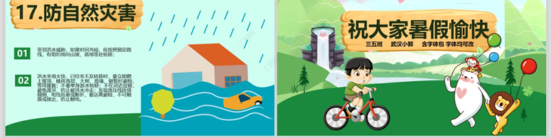<p>暑假安全教育班會暑假教育主題班會三五班 武漢小郭 含字體包 字體均可改</p><br><p> 圍繞防溺水、防火防災(zāi)、防交通意外等暑期易發(fā)的安全問題對學(xué)生和家長進(jìn)行警示教育和引導(dǎo)提高家長和學(xué)生的安全意識,并訓(xùn)練其自救和自護(hù)能力,使學(xué)生度過一個平安、快樂的假期。</p><br><p> 離校時務(wù)必整理好自己的物品,不要將貴重物品留在宿舍內(nèi),</p><br><p>離開宿舍前務(wù)必切斷所有電源,關(guān)好門窗,做好防火。</p><br><p>不得乘坐超員超載,無牌無證車輛回家。學(xué)生離校和返校盡可能叫家長接送。有同鄉(xiāng)者最好結(jié)伴同行。</p><br><p> 假期走親訪友,要懂禮貌,尊重當(dāng)?shù)氐娘L(fēng)俗習(xí)慣;</p><br><p>暑期學(xué)生外出乘坐公共交通工具時,應(yīng)該注意乘坐正規(guī)的公交車輛,遵守上下車秩序。不將身體伸到車外,不向車外亂擲物品,不在機(jī)動車道內(nèi)攔出租車。</p><br><p>未成年學(xué)生不準(zhǔn)駕駛機(jī)動車輛全體學(xué)生不能乘坐拖拉機(jī)、農(nóng)用車、三輪摩托車,以及無牌無證、套牌報廢、超載超速的車輛,不能闖紅燈和隨意橫穿公路。</p><br><p>過馬路時要遵守交通信號,橫過道路走人行橫道等過街設(shè)施不要邊走路邊看書或追逐打鬧,也不要在道路上玩滑板、滑輪</p><br><p>熟悉掌握食品衛(wèi)生安全知識不到無證經(jīng)營的流動攤點(diǎn)購買食品不吃來源不明、標(biāo)簽不清、變質(zhì)過期、無衛(wèi)生保障的劣質(zhì)食品</p><br><p>勤洗手特別是飯前便后不吃生、冷、不清潔食物不吃變質(zhì)剩飯菜少吃、不吃冷飲,少吃、不吃零食不要長期吃辛辣食品</p><br><p>不要隨便吃野果,吃水果后不要急于喝飲料特別是水劇烈運(yùn)動后不要急于吃食品喝水不到無證攤點(diǎn)購買油炸、煙熏食品。謹(jǐn)慎選購包裝食品,認(rèn)真查看包裝標(biāo)識</p><br><p>不準(zhǔn)私自下水游泳;不準(zhǔn)擅自與他人結(jié)伴游泳;不準(zhǔn)在無家長或教師帶領(lǐng)的情況下游泳;不準(zhǔn)到無安全設(shè)施、無施救人員的水域游泳;不準(zhǔn)到不熟悉的水域游泳;不準(zhǔn)不熟悉水性的學(xué)生擅自下水施救</p><br><p>忌飯前飯后游泳;忌猛烈運(yùn)動后游泳;忌在不熟悉的水域游泳;忌長時間暴曬游泳;忌不做準(zhǔn)備活動即游泳;忌游時過久;忌無視泳后衛(wèi)生。</p><br><p>不要慌張,發(fā)現(xiàn)周圍有人時立即呼救用腳踢水,防止體力喪失,等待救援身體下沉?xí)r,可將手掌向下壓如果在水中突然抽筋,又無法靠岸時,立即求救</p><br><p>可將救生圈、竹竿、木板等物拋給溺水者,再將其拖至岸邊;若沒有救護(hù)器材,可入水直接救護(hù)。接近溺水者時要轉(zhuǎn)動他的髖部,使其背向自己然后拖運(yùn)。拖運(yùn)時通常采用側(cè)泳或仰泳拖運(yùn)法。特別強(qiáng)調(diào):未成年人發(fā)現(xiàn)有人溺水,不能冒然下水營救,應(yīng)立即大聲呼救,或利用救生器材呼救010203</p><br><p>01遇火災(zāi)險情,先關(guān)閉房內(nèi)電源,并撥打校內(nèi)報警電話可視火情撥“119”報警。不準(zhǔn)玩火,不得攜帶火種小心、安全使用煤氣0203不亂丟煙頭等易燃物</p><br><p>不與陌生人交往,不結(jié)交不良朋友,不進(jìn)網(wǎng)吧、游戲廳、歌舞廳等不閱讀不健康的書刊雜志和非法、淫穢出版物不攜帶管制刀具等危險物品,不打架斗毆,</p><br><p> 要提醒孩子在假期中遵紀(jì)守法發(fā)現(xiàn)危險,要機(jī)智勇敢、果斷沉著地保護(hù)自己</p><br><p>不上網(wǎng)與陌生人聊天不單獨(dú)與網(wǎng)上認(rèn)識的人會面不輕信網(wǎng)絡(luò)中獎、購物等“網(wǎng)絡(luò)陷阱”不瀏覽不合法、不健康的網(wǎng)站</p><br><p>1、學(xué)習(xí)用電常識,在家學(xué)會安全使用普通的家用電器。2、不要亂插、私接電源,不要用濕手去插、拔電源插頭,或開關(guān)電源。</p><br><p>雷雨閃電時,不要撥打、接聽電話,關(guān)閉手機(jī)。因電話線和手機(jī)的電磁波會引入雷電傷人。0102</p><br><p>雷雨天氣盡量不要在曠野里行走,如果有急事需要趕路時,要穿塑料等不侵水的雨衣; </p><br><p>受到洪水威脅,如果時間充裕,應(yīng)按照預(yù)定路線,有組織地向山坡、高地等處轉(zhuǎn)移;洪水來得太快,已經(jīng)來不及轉(zhuǎn)移時,要立即爬上屋頂、樓房高層、大樹、高墻,做暫時避險,等待援救;不要單身游水轉(zhuǎn)移;不在河邊逗留,避免渡河,防止被洪水沖走;發(fā)現(xiàn)高壓線鐵塔傾倒、電線低垂或斷折,要遠(yuǎn)離避險,不可觸摸或接近,防止觸電。0102</p><br><p>暑假安全教育班會祝大家暑假愉快三五班 武漢小郭 含字體包 字體均可改</p><br>